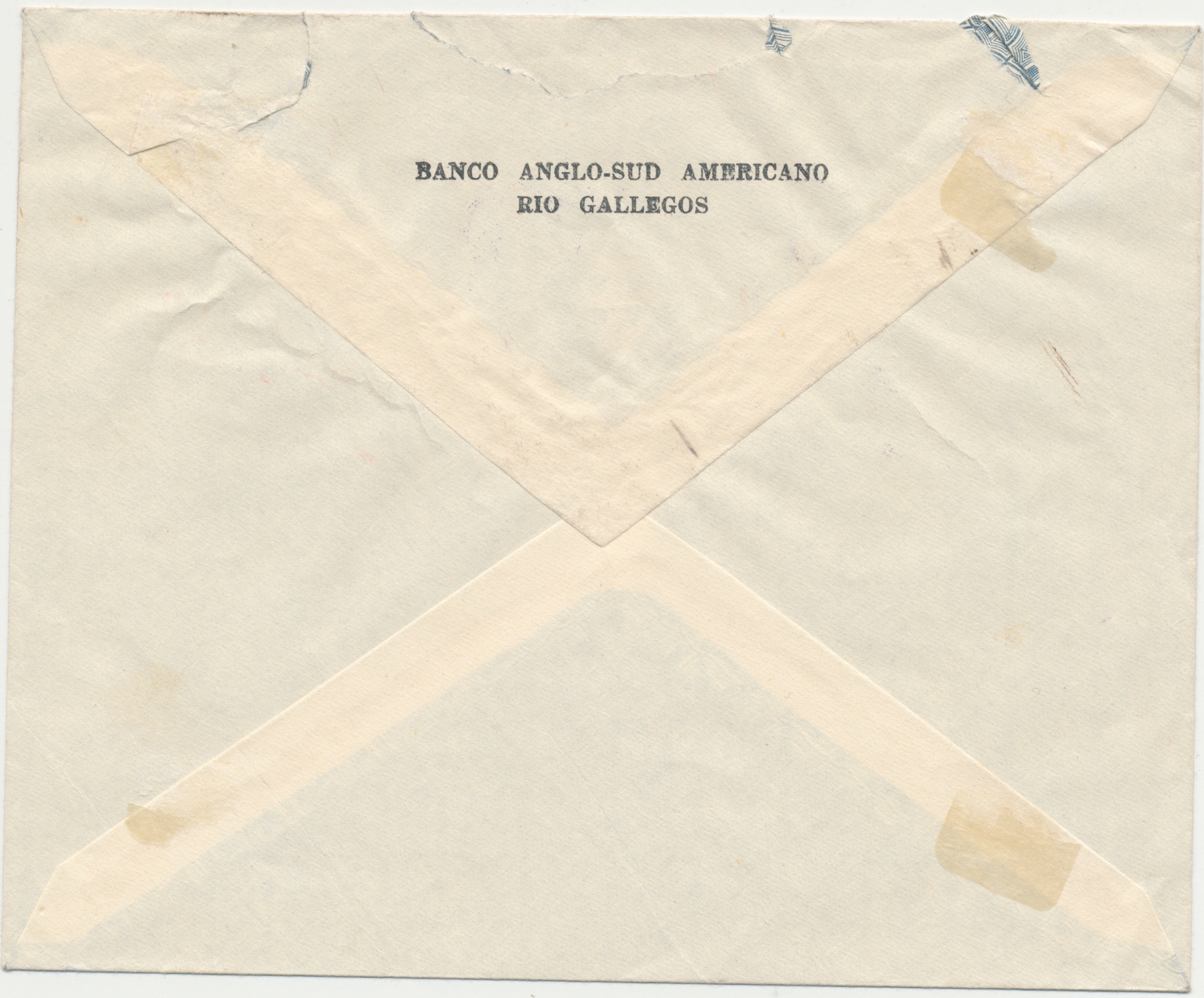 Autopost Rio Gallegos - Magallanes: 10 C. San Martin auf Brief der "Banco Anglo-Sud Americano" in Rio Gallegos nach Magallanes, entwertet mit violettem Stempel Auto Correio Official / ... Alfredo Santucci / Magallanes - Rio Gallegos, ca. 1932, Bedarf
