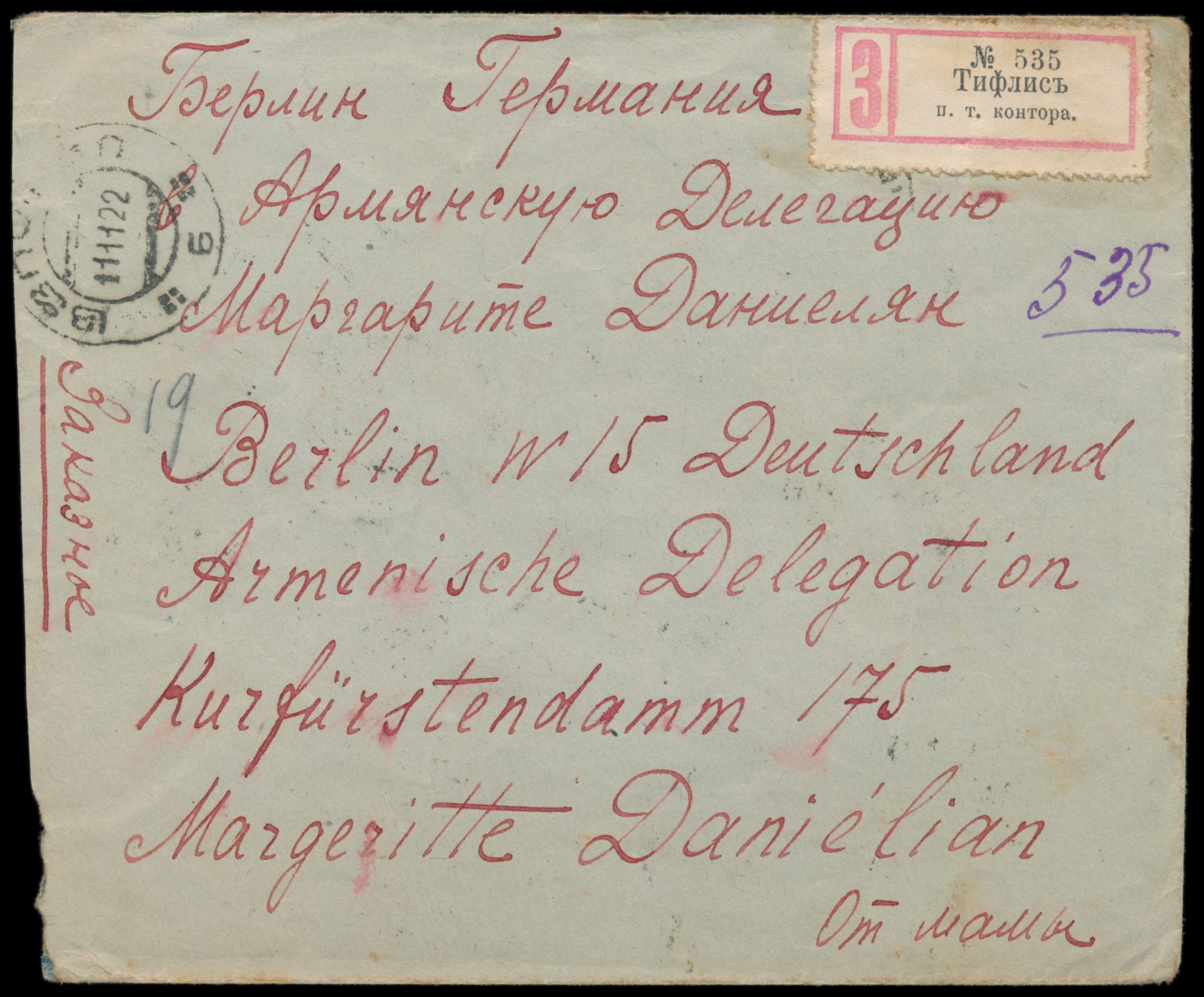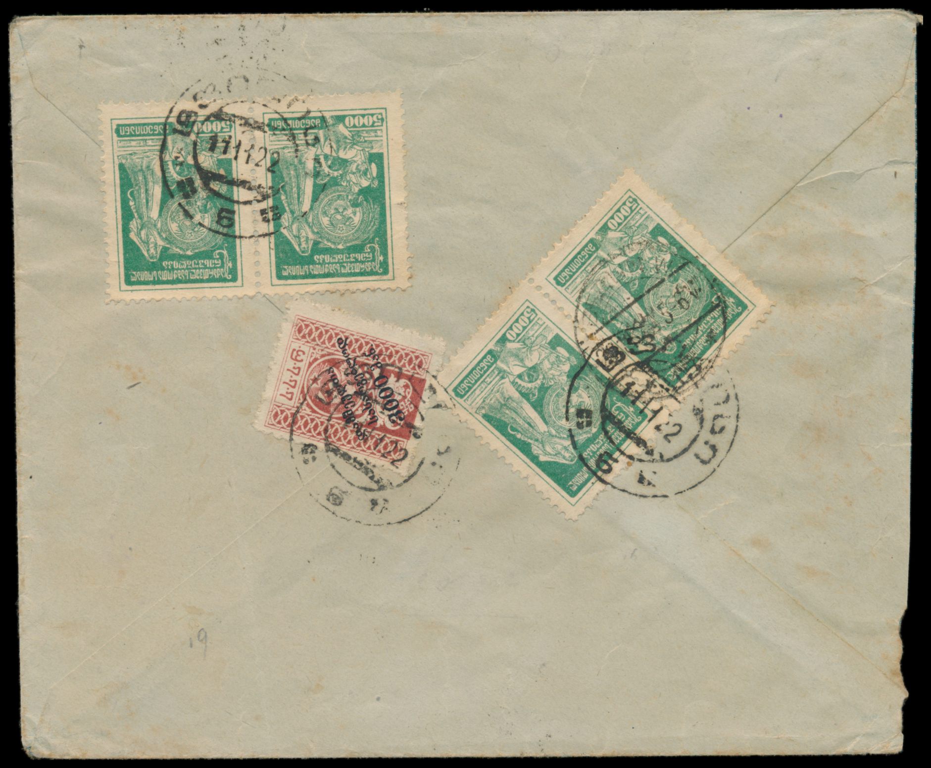 Sowjet-Republik, 4 x 5000 R. und 3000 R. "Hungerhilfe" rückseitig auf Einschreibbrief mit Stempel Tiflis 11.11.22 und russischem 3-Zettel an die Armenische Delegation in Berlin, Ankunftstempel 29.11.22, Bedarf