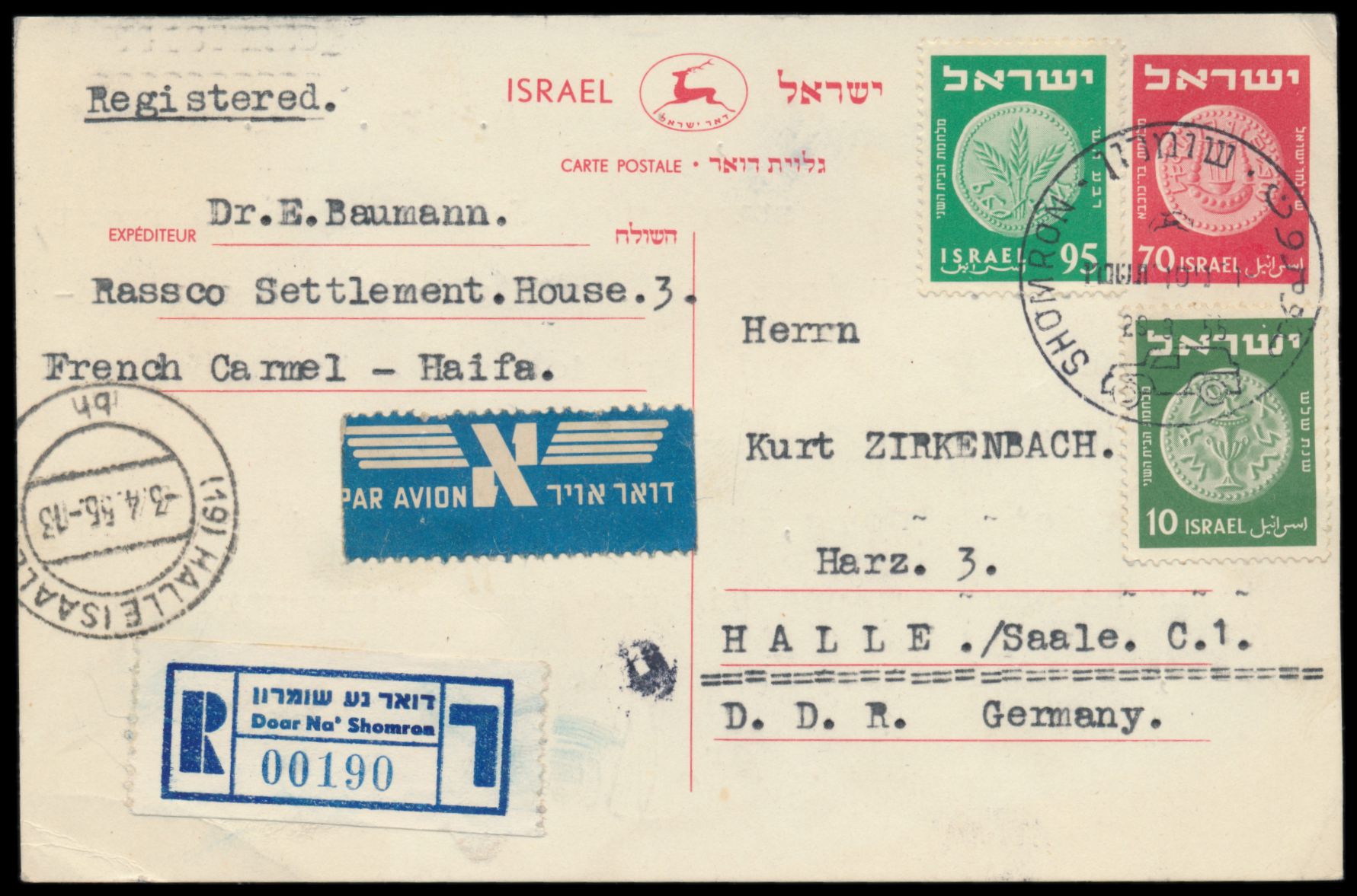 Ganzsache 70 Pr. mit Zusatzfrankatur 10 Pr. und 95 Pr. als Luftpost-Einschreiben nach Deutschland, Auto-Poststempel Shomron 29.3.55 (Ersttag) und R-Zettel Doar Na´ - Shomron, Ankunftstempel Halle (Saale) 3.4.55, Bedarf
