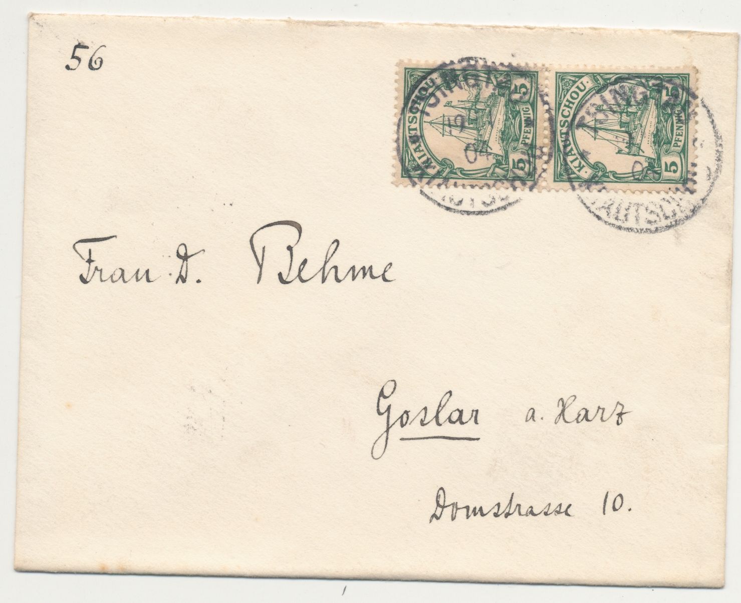 Zwei Briefe einer Korrespondenz aus Tsingtau über Sibirien nach Deutschland: Brief mit Russische Post in China 1 Kop. und 3 x 3 Kop. mit Stempel Tschifu 27.7.1903 und Ankunftstempel Goslar 19.8.03, sowie Brief mit Kiautschou 2 x 5 Pf. und Stempel Tsingtau 19.1.04 und Ankunftstempel Goslar 12.2.04, Bedarf, aus der Korrespondenz des Dr. Friedrich BehmeStichwörter: China, Rußland / UdSSRPostleitzahl: 386