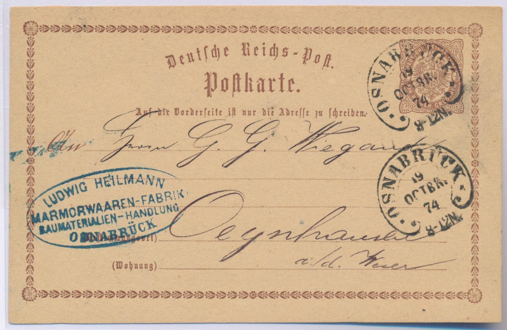 Osnabrück, Hufeisenstempel mit Zierpunkten 19.10.1874, 2 Abschläge auf Ganzsache 1 Gr nach Oeynhausen, Spalink Nr. 30-1