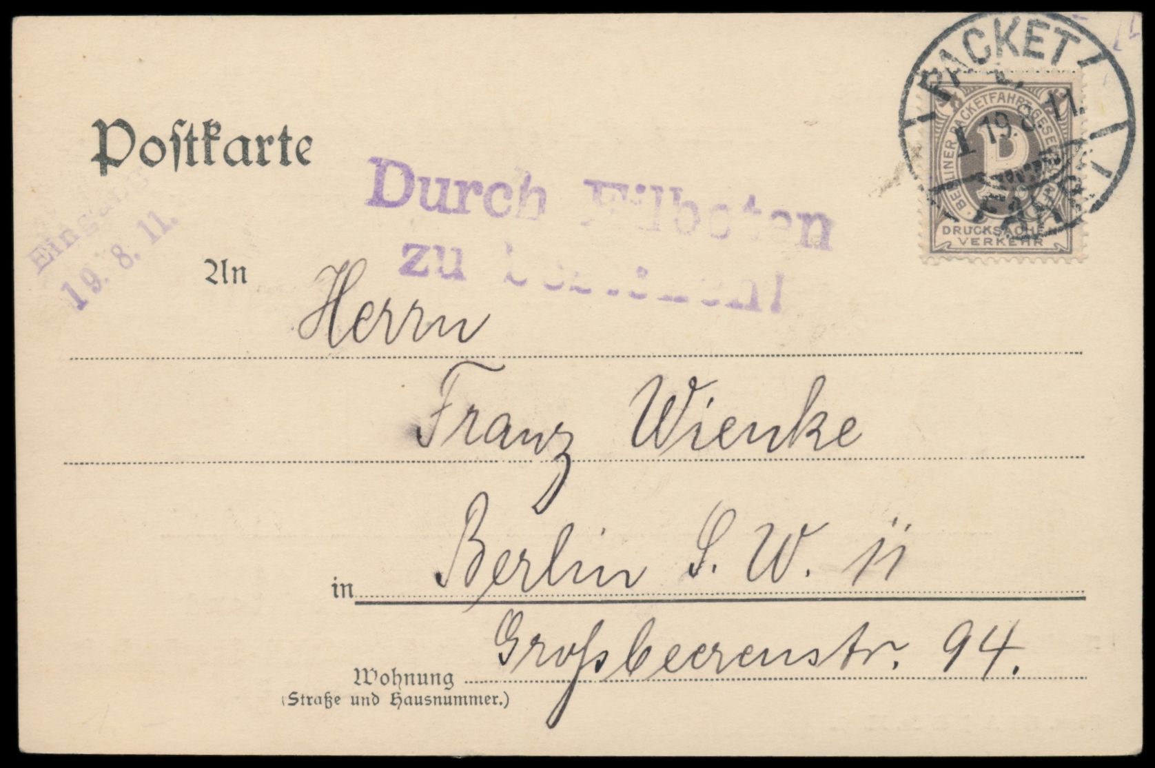 Berliner Packetfahrt-Gesellschaft, Marke für den Drucksachenverkehr ohne Wertangabe in grau (MiNr 86) auf Karte der Berliner Packetfahrt-Gesellschaft (Verlustmitteilung über eine Sendung Bücher nach Brandenburg), Stempel Packet-Fahrt 19.8.11, Bedarf