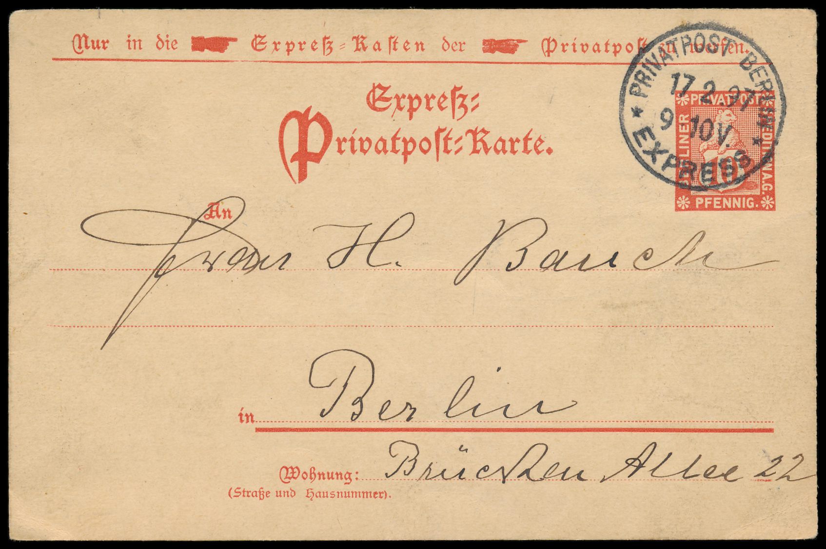 Berliner Privatpost und Spedition A. G., Sondermarke zur Internat. Mode-Ausstellung im Meß-Palast 2 Pf. (MiNr. 5) auf Firmenkarte, Stempel Privatpost 21.10.96, Bedarf