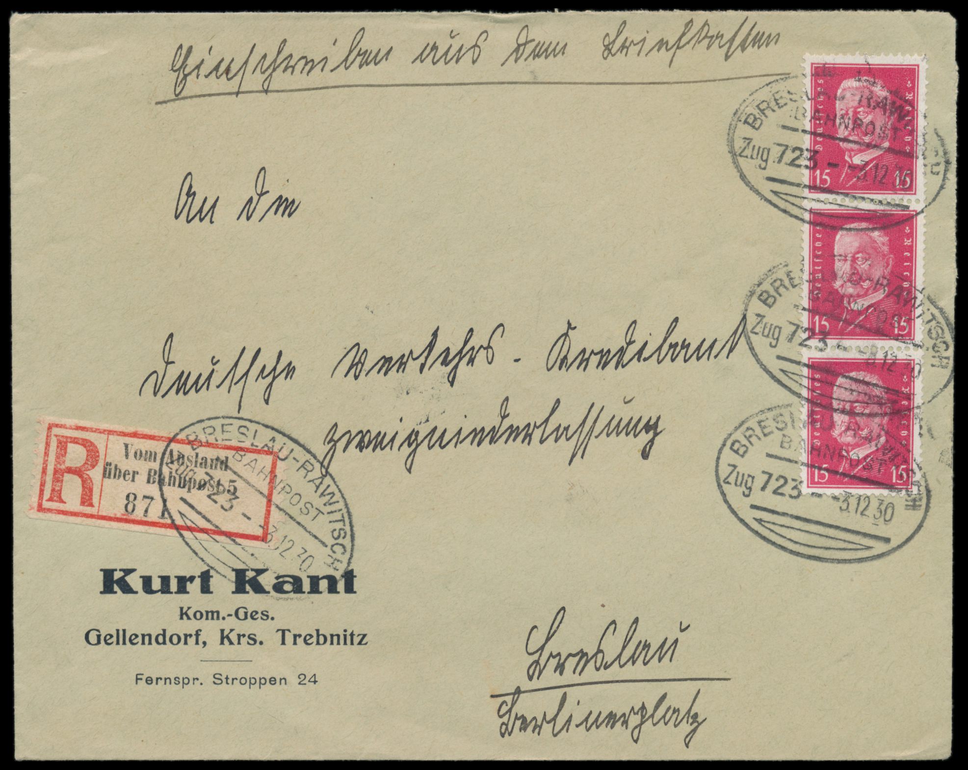 Breslau - Rawitsch Zug 723 3.12.30, Ovalstempel auf Einschreibbrief mit 3 x 15 Pf. Hindenburg nach Breslau, gleicher Stempel auch auf R-Zettel "Vom Ausland über Bahnpost 5" , vorderseitig Absender "... Gellendorf, Krs. Trebnitz ...", Ankunftstempel 4.12.30