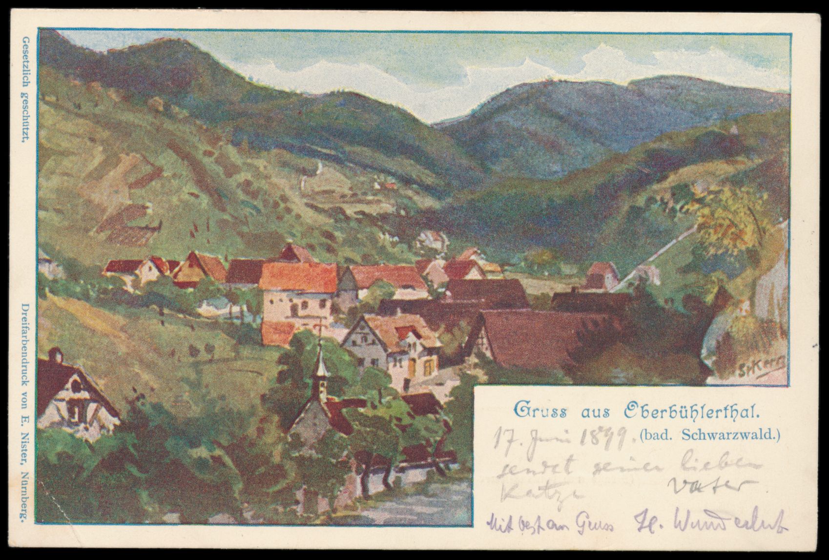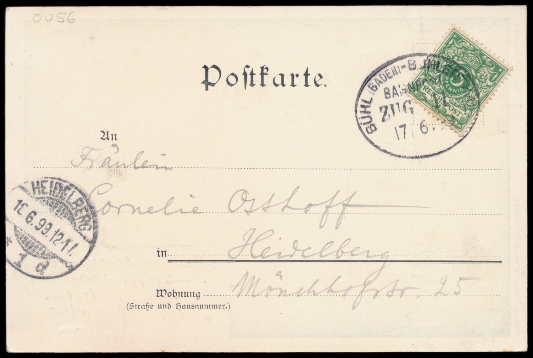 Bühl - Bühlerthal, Ovalstempel Zug 11 17.6.99 auf 5 Pfg. Krone/Adler, Kleinbahn der Bühlertalbahn (6 km), Ankunftstempel Heidelberg, Bedarf, Ansichtskarte von Oberbühlerthal, sign. Kern (Holzwerk, Eigentümer)
