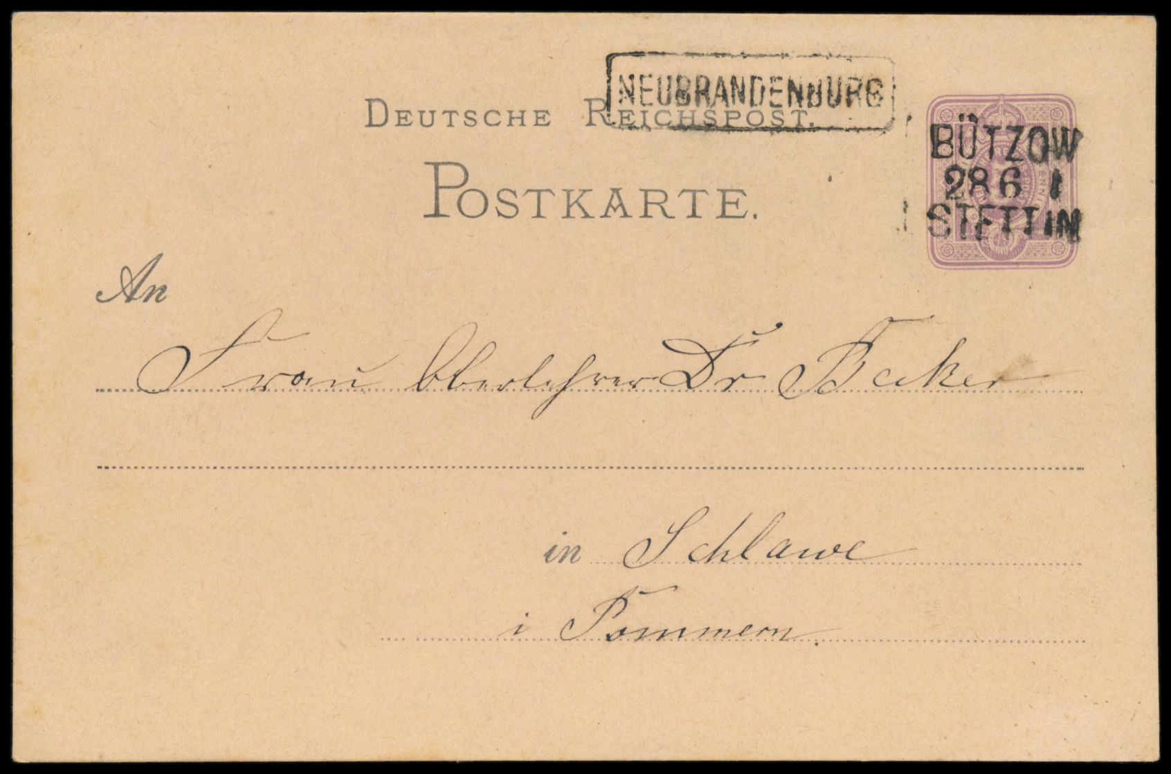 Bützow - Stettin, Bahnpost-L3 28.6. I und Aufgabe-R1 Neubrandenburg auf Ganzsache nach Schlawe, Bedarf