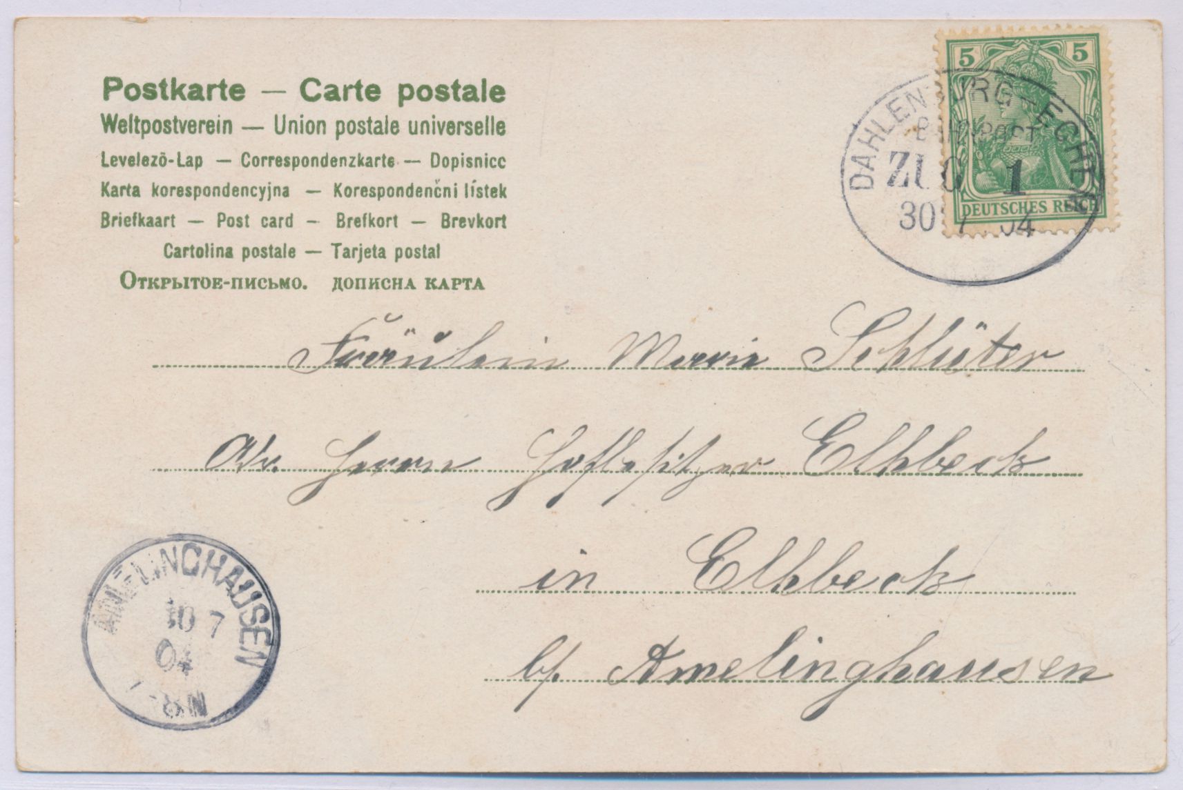 Dahlenburg - Echem Zug 1 30.7.04, Stumpfovalstempel der Bleckeder Kreisbahn (Schmalspur 750 mm), 1. Verwendungsjahr des Stempels, auf Ansichtskarte, geschrieben in Barskamp, Ankunftstempel Amelinghausen 30.7.04
