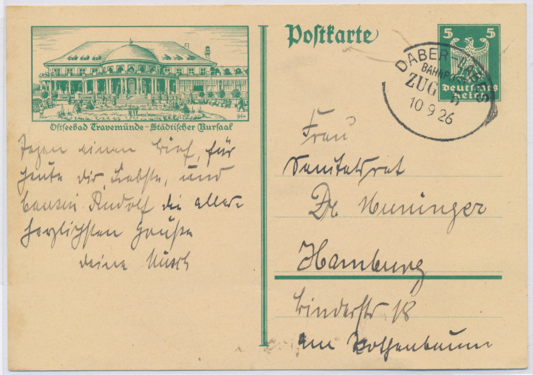 Daber - Labes Zug 5 10.9.26, Stumpfovalstempel der Regenswalder Bahn (Kleinbahn, Meterspur) auf Bildganzsache aus Reckow nach Hamburg, Bedarf