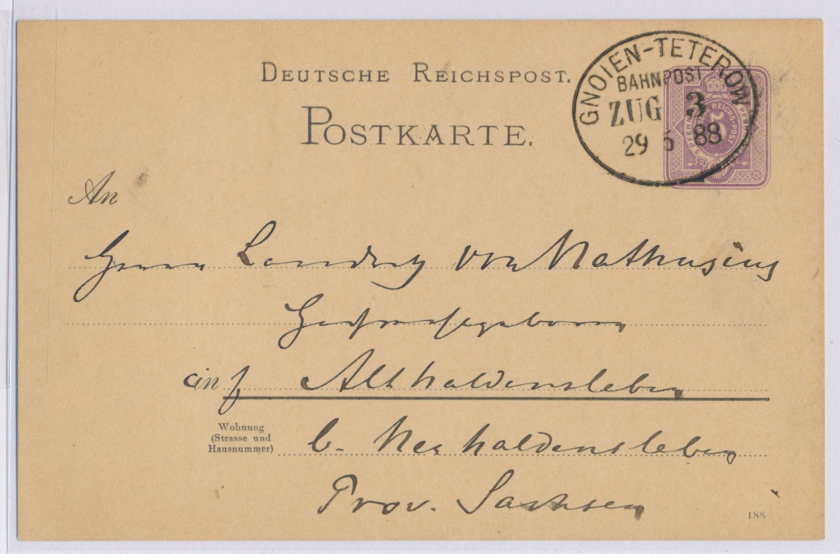 Gnoien - Teterow Zug 3 29.5.88, Stumpf-Ovalstempel auf Ganzsache 5 Pf. nach Althaldensleben, Kleinbahn (Verstaatlichung erst 1890), Bedarf