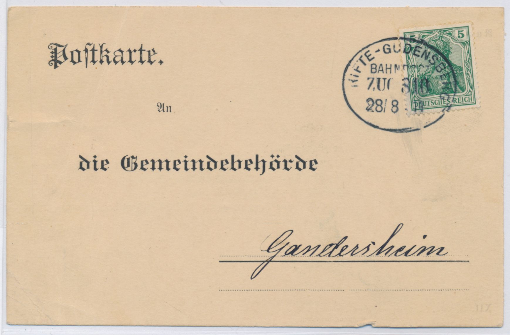 Grifte - Gudensberg, Ovalstempel Zug 810 28.8.11 auf Karte mit 5 Pfg. Germania nach Gandersheim, Kleinbahn