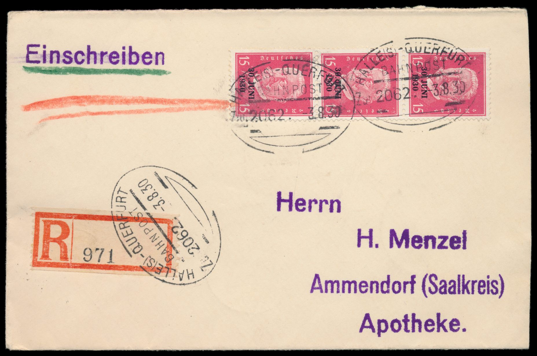 Halle (S.) - Querfurt Z. 2062, Ovalstempel 3.8.30 auf Einschreibbrief mit 3 x 15 Pf. Hindenburg, Bahnpoststempel auch auf Blanko-R-Zettel , nach Ammendorf, Ankunftstempel 4.8.30