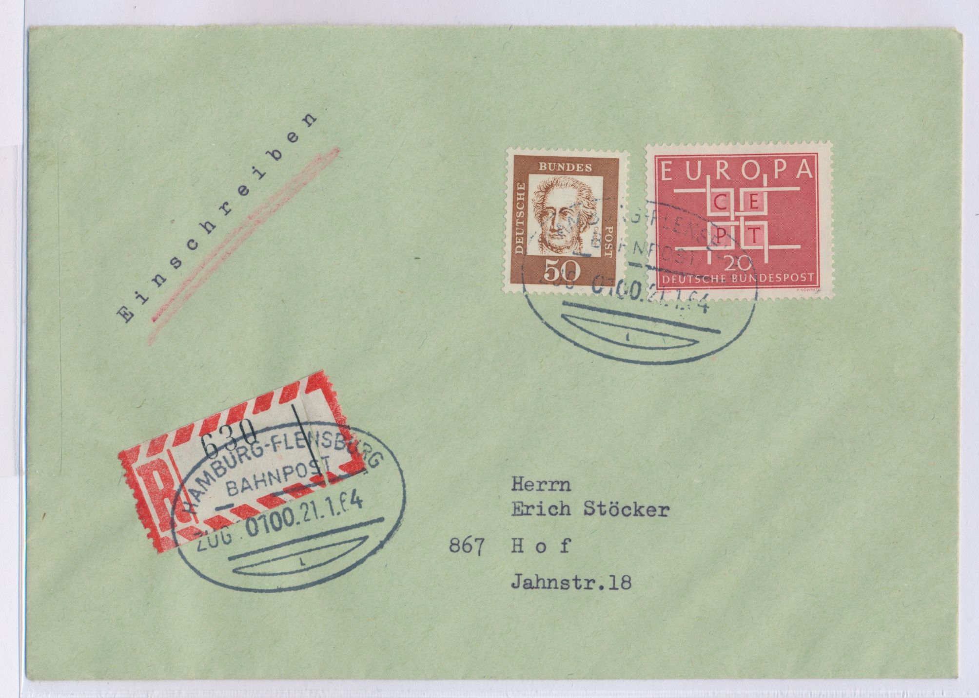 Hamburg - Flensburg Zug 0100, Ovalstempel mit UB L, 21.1.64, Einschreibbrief mit BRD-Frankatur 70 Pf., gleicher Bahnpoststempel auch auf Blanko-R-Zettel, nach Hof