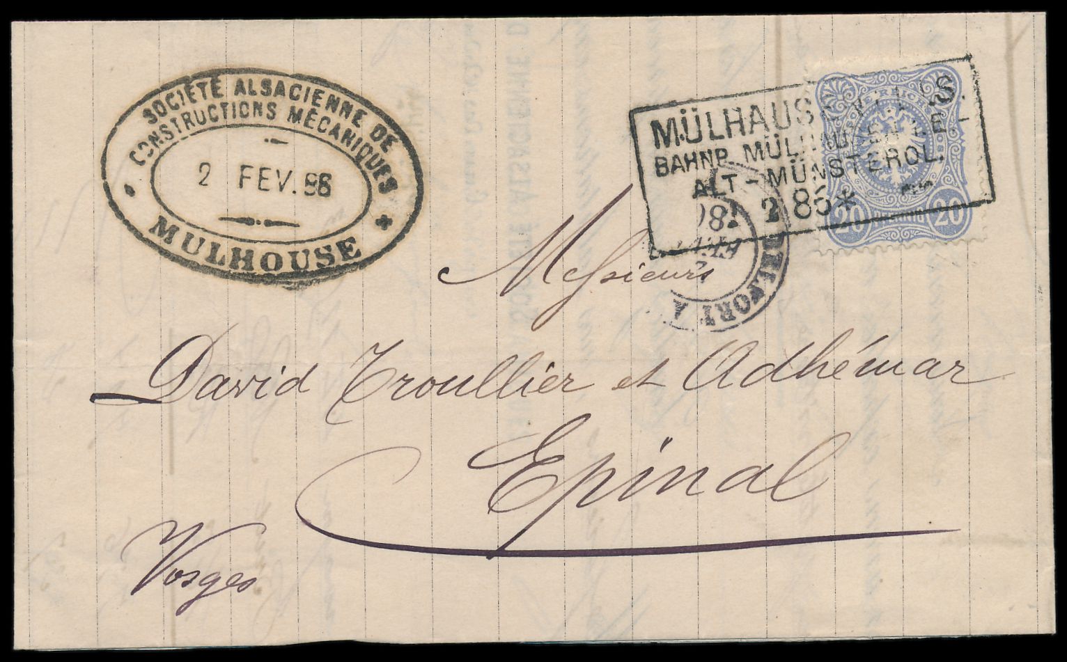 R4 Mühlhausen i. Els / Bahnp Mühlhausen i. E. / Alt-Münsterol / 2.2.86 auf Faltbrief mit 20 Pf. nach Frankreich, Ankunftstempel Epinal