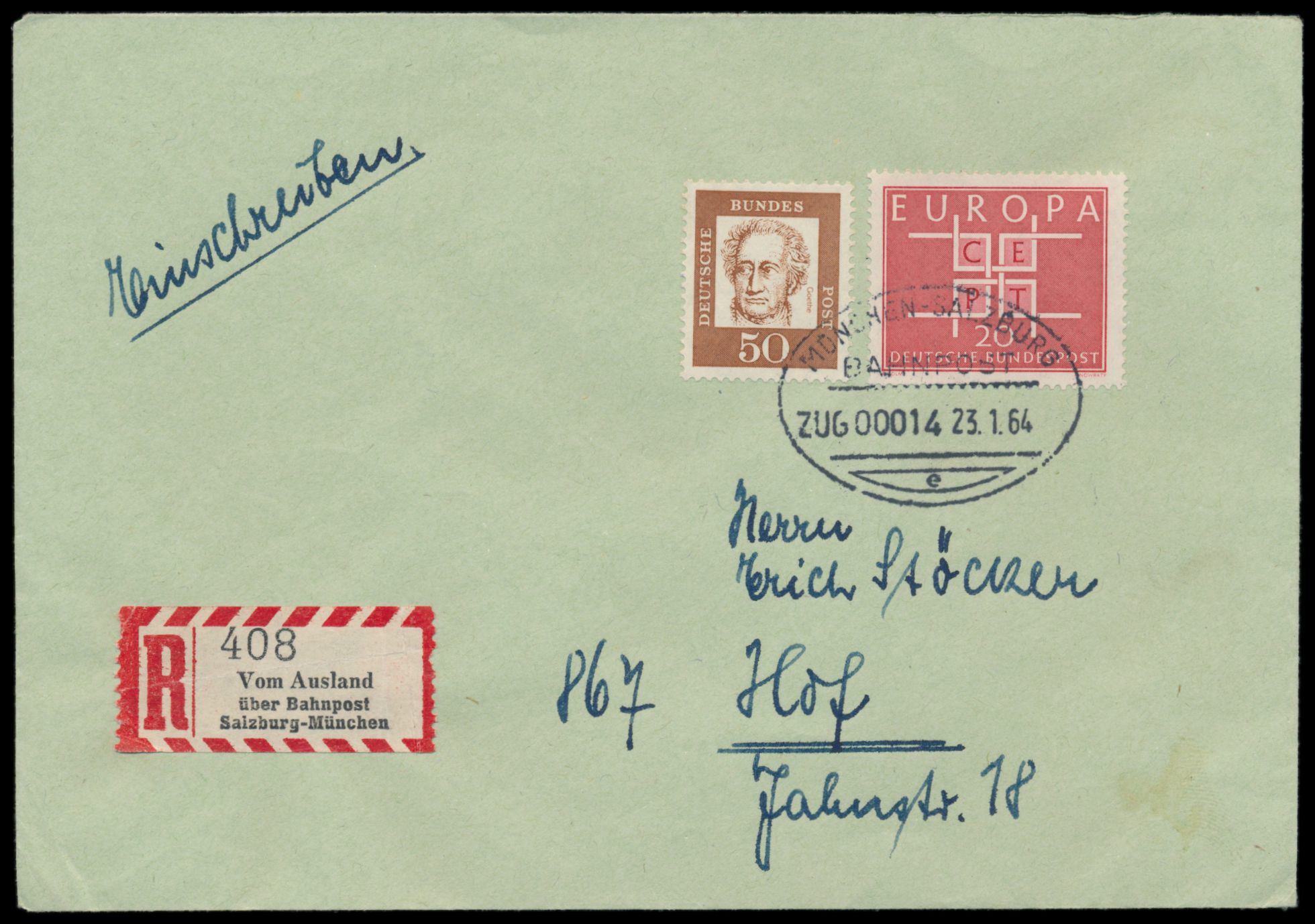 München - Salzburg Zug 14, Ovalstempel mit UB e, 23.1.64, Einschreibbrief mit BRD-Frankatur 70 Pf., R-Zettel "Vom Ausland über Bahnpost Salzburg - München"