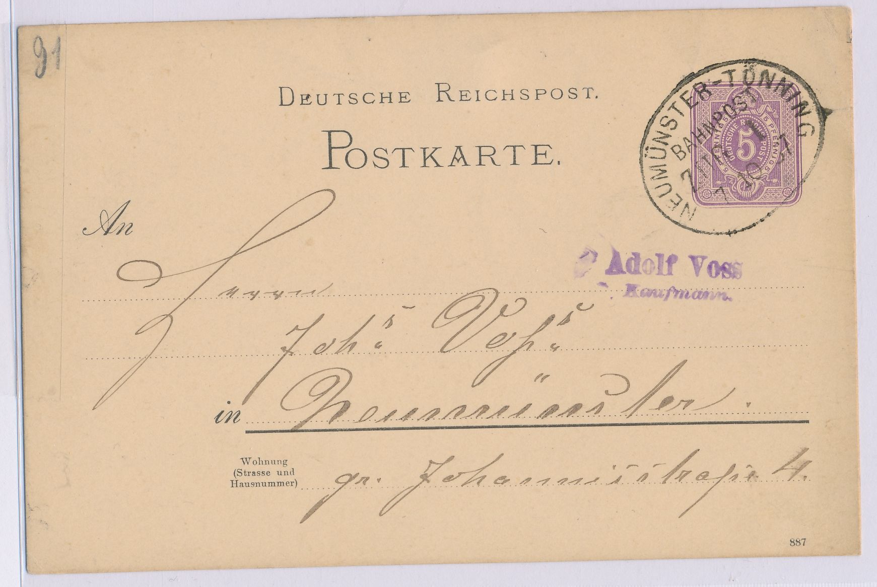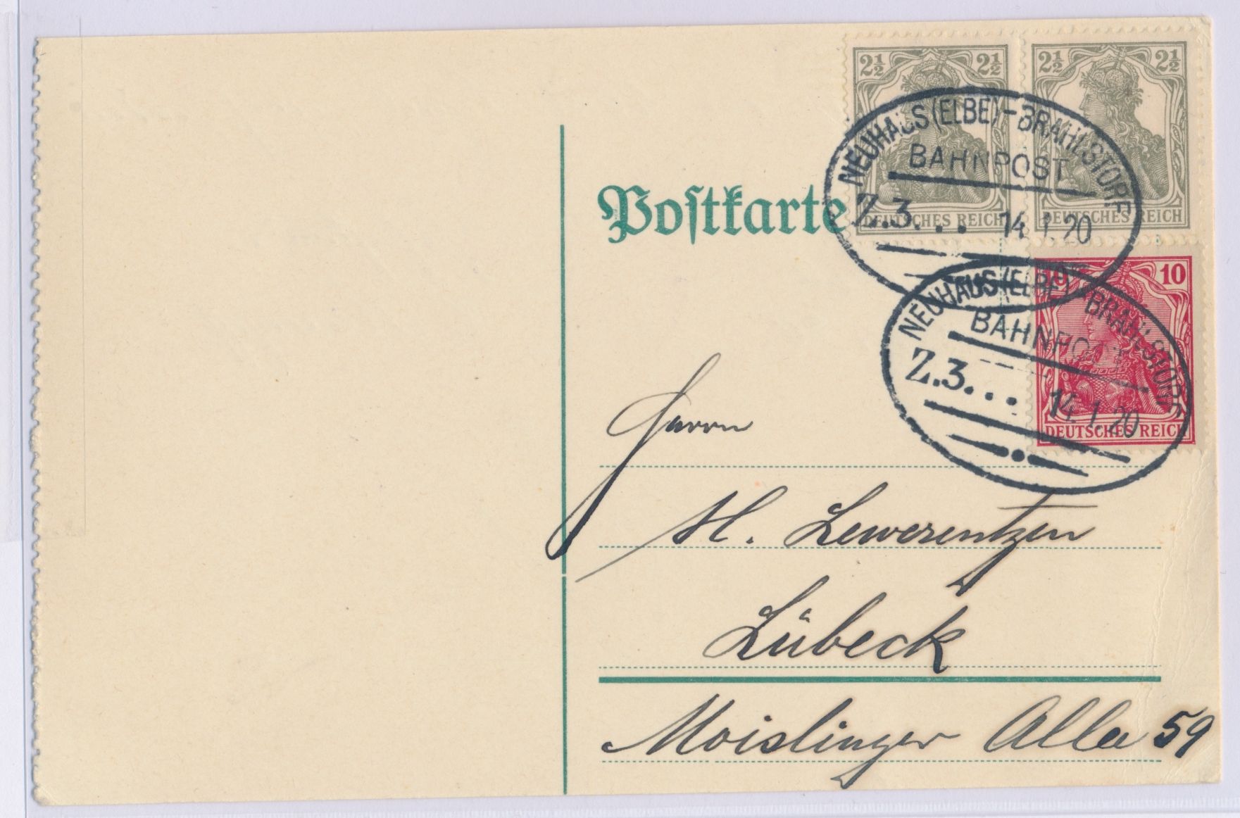 Neuhaus (Elbe) - Brahlstorf Z.3... 14.1.20, Ovalstempel der Kleinbahn (Streckenlänge 11 Kilometer, Normalspur) auf Postkarte nach Lübeck, Frankatur 2 x 2 1/2 Pf. und 10 Pf. Germania, Bedarf