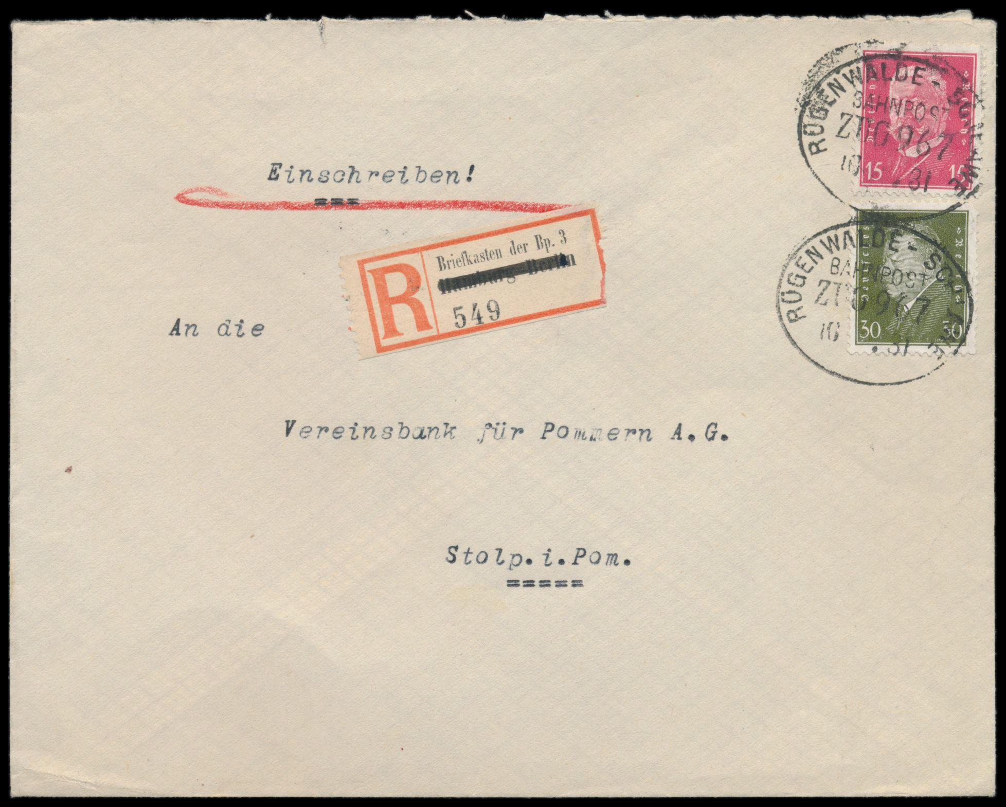 Rügenwalde - Schlawe Zug 967, Stumpfovalstempel 10.2.31 auf Einschreibbrief mit 15 Pf. und 30 Pf. nach Stolp, R-Zettel "Briefkasten der Bp. 3 Hamburg - Berlin" , Streckenbezeichnung gestrichen, Ankunftstempel 10.2.31, Bedarf