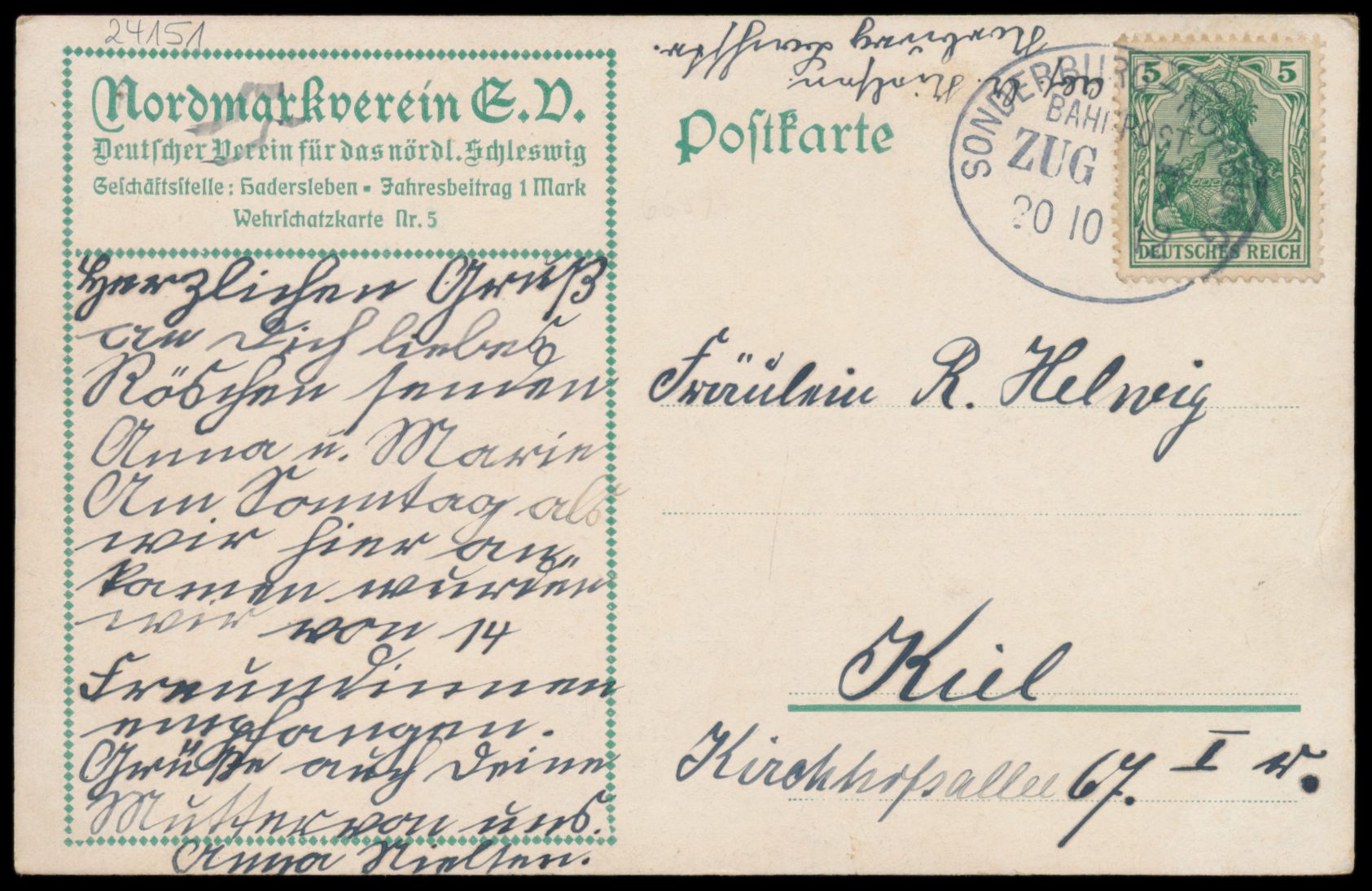 Sonderburg - Norburg Zug 7 20.10.12, Stumpfovalstempel der Kleinbahn (Schmalspur) auf der Insel Als, Nordmarkverein-AK mit 5 Pf. Germania nach Kiel, Bedarf