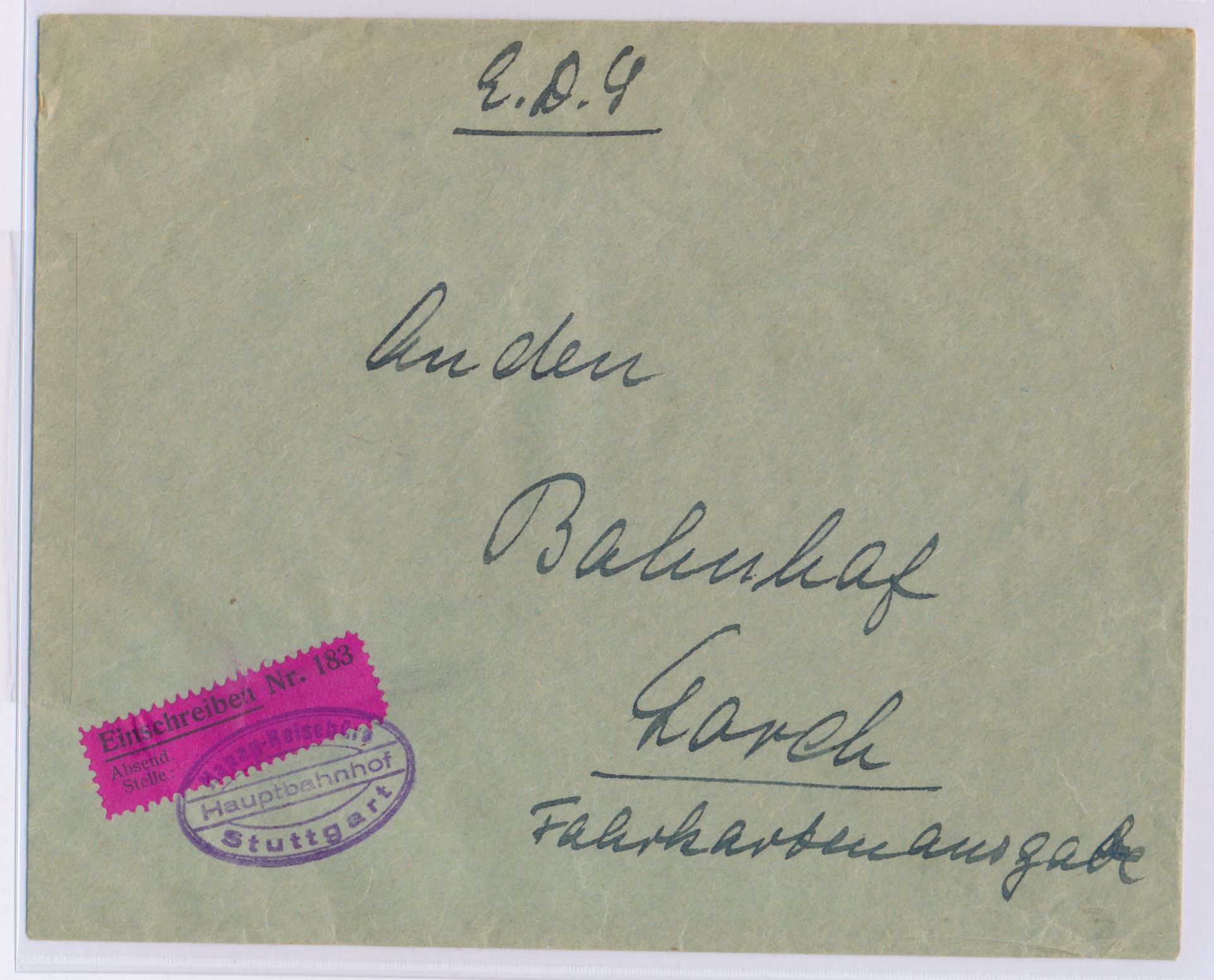 Eisenbahn-Dienstsache als Einschreiben von Stuttgart nach Lorch, rosa Aufkleber "Einschreiben Nr. 183" und Ovalstempel "Hapag-Reisebüro Hauptbahnhof Stuttgart"
