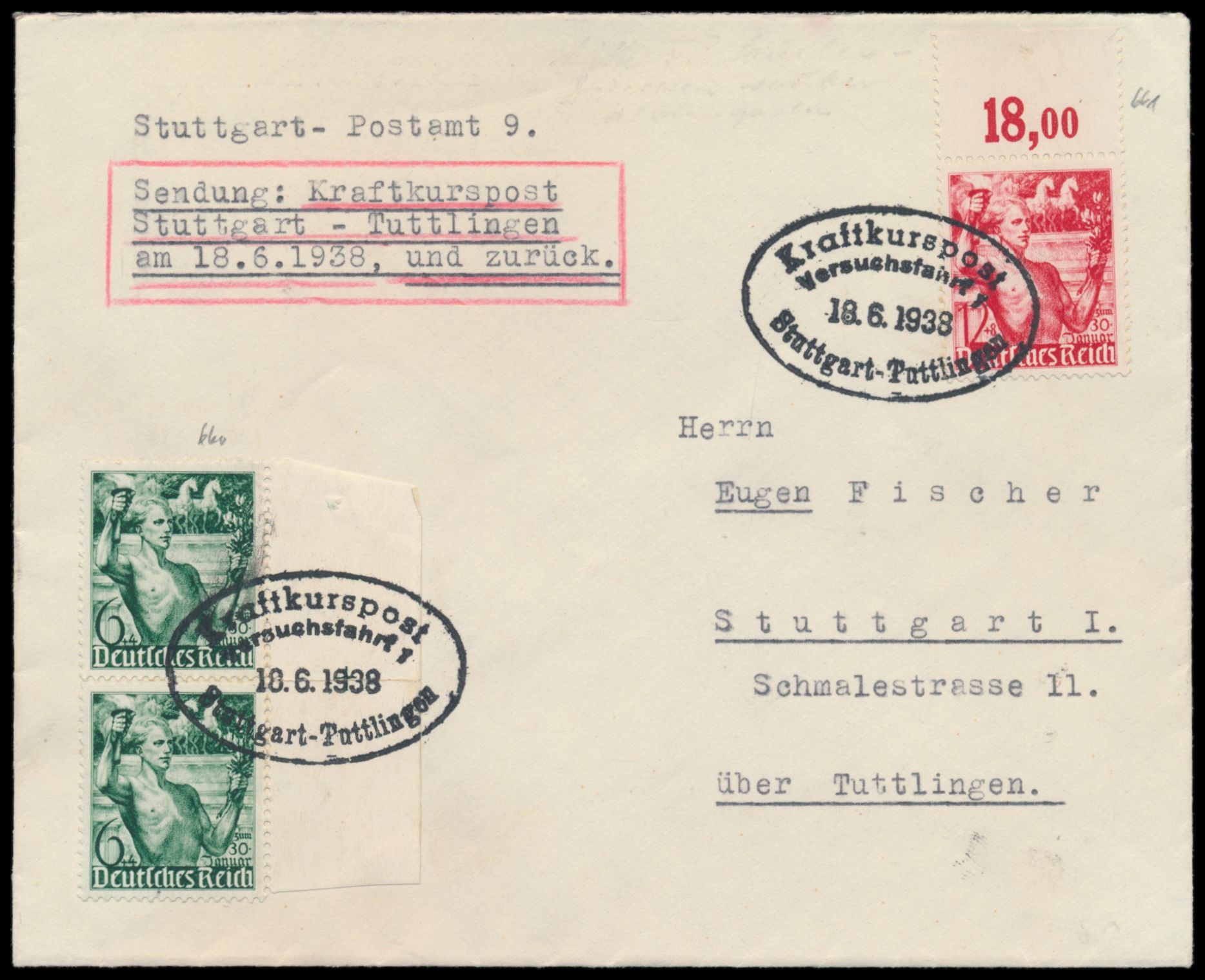Ovalstempel Kraftkurspost Versuchsfahrt 1 Stuttgart - Tuttlingen 18.6.1938 auf Brief mit Sondermarken-Frankatur nach Stuttgart