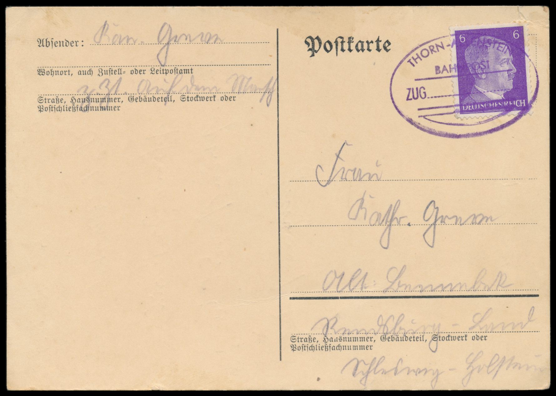 Thorn - Allenstein, violetter Not-Ovalstempel auf Postkarte mit 6 Pf. Hitler nach Alt-Brambek bei Rendsburg, geschrieben am 15.10.1942, Bedarf