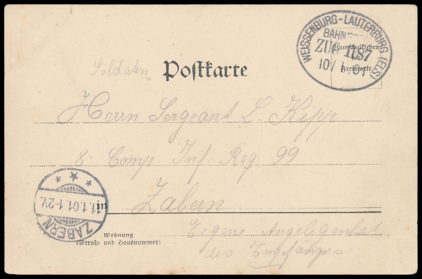 Weissenburg - Lauterburg (Els.) Zug 1187 10.1.01, sehr frühes Stempeldatum der erst am 1.7.1900 in Betrieb genommenen Strecke (Länge ca. 21 Km), Stumpfovalstempel auf portofreier Soldatenkarte nach Zabern, Ankunftstempel 11.1.01, Bedarf