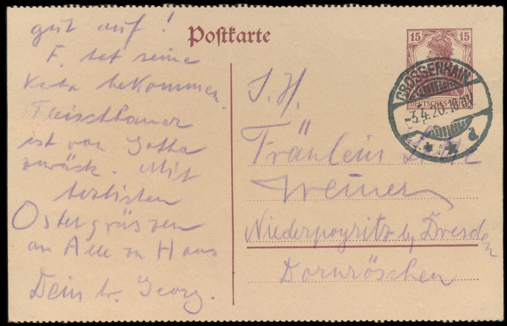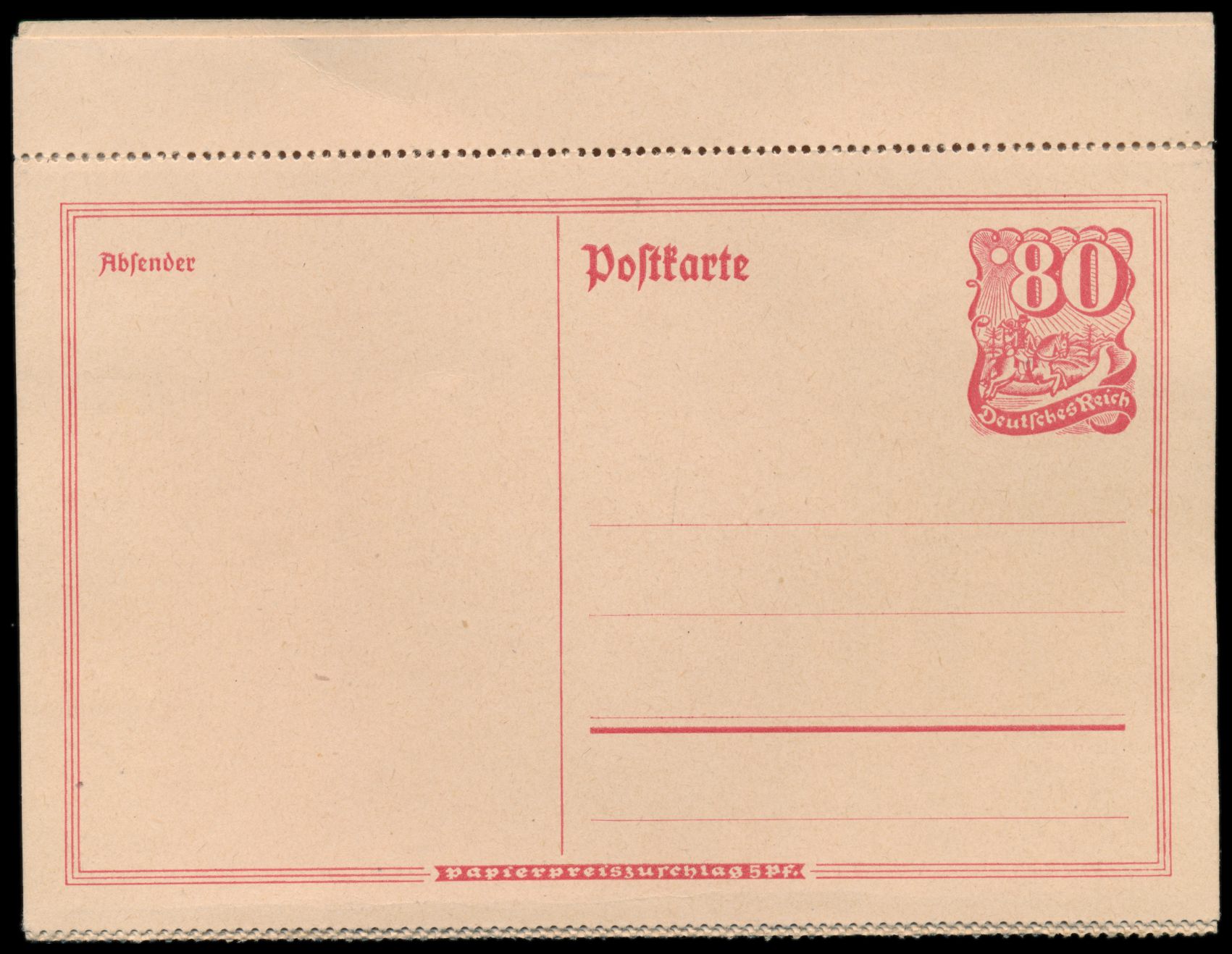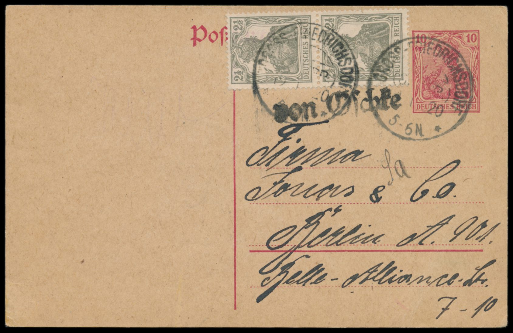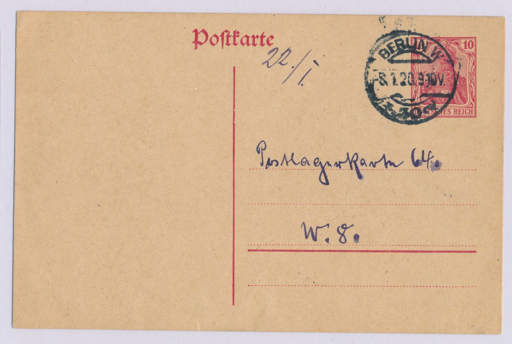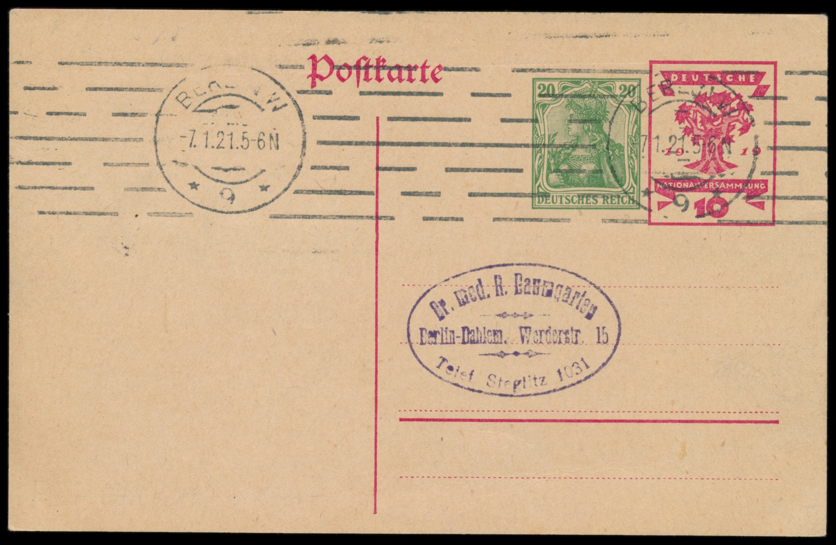 Ganzsache 10 Pf. Nationalversammlung mit Zudruck eines zweiten Wertstempels 20 Pf. Germania grün, Maschinenstempel Berlin W 9 7.1.21, Ortskarte, portorichtig, Bedarf