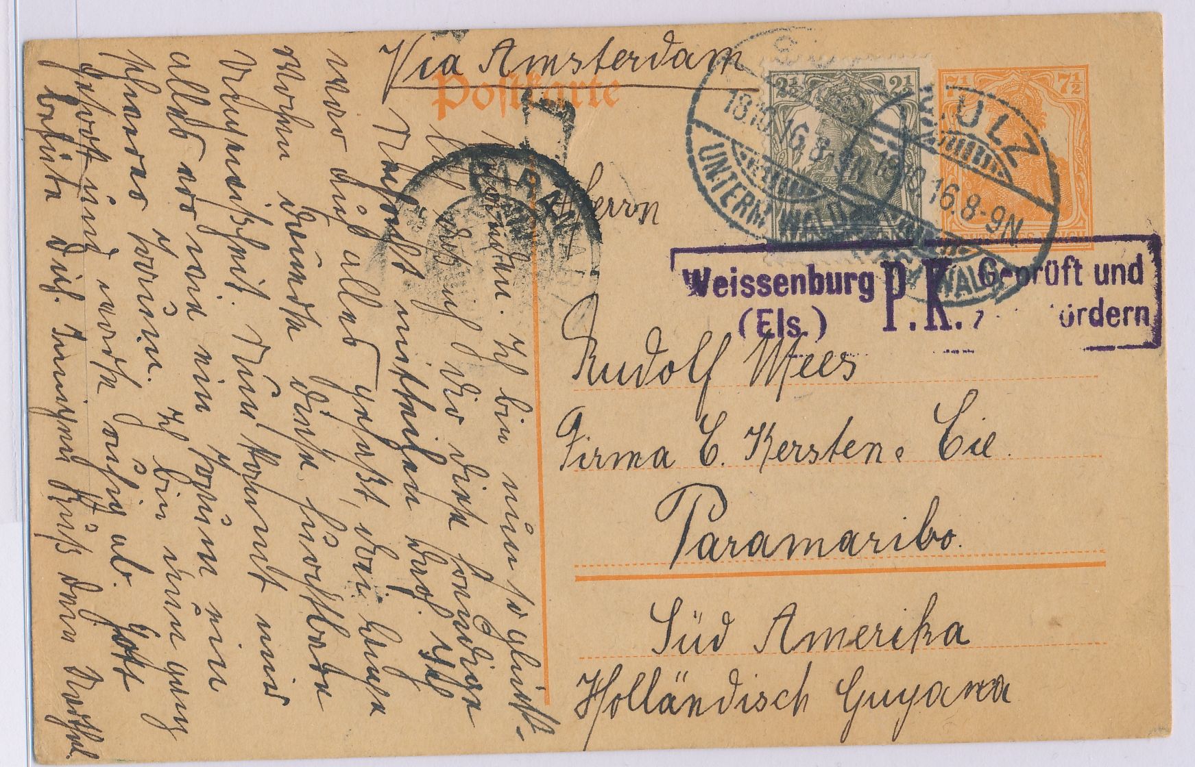 Ganzsache 7 1/2 Pf. mit Zusatzfrankatur 2 1/2 Pf. nach Suriname, Stempel Sulz unterm Wald 18.10.16, Zensurstempel Weissenburg (Els.), Ankunftstempel Paramaribo, Bedarf, seltene Destination