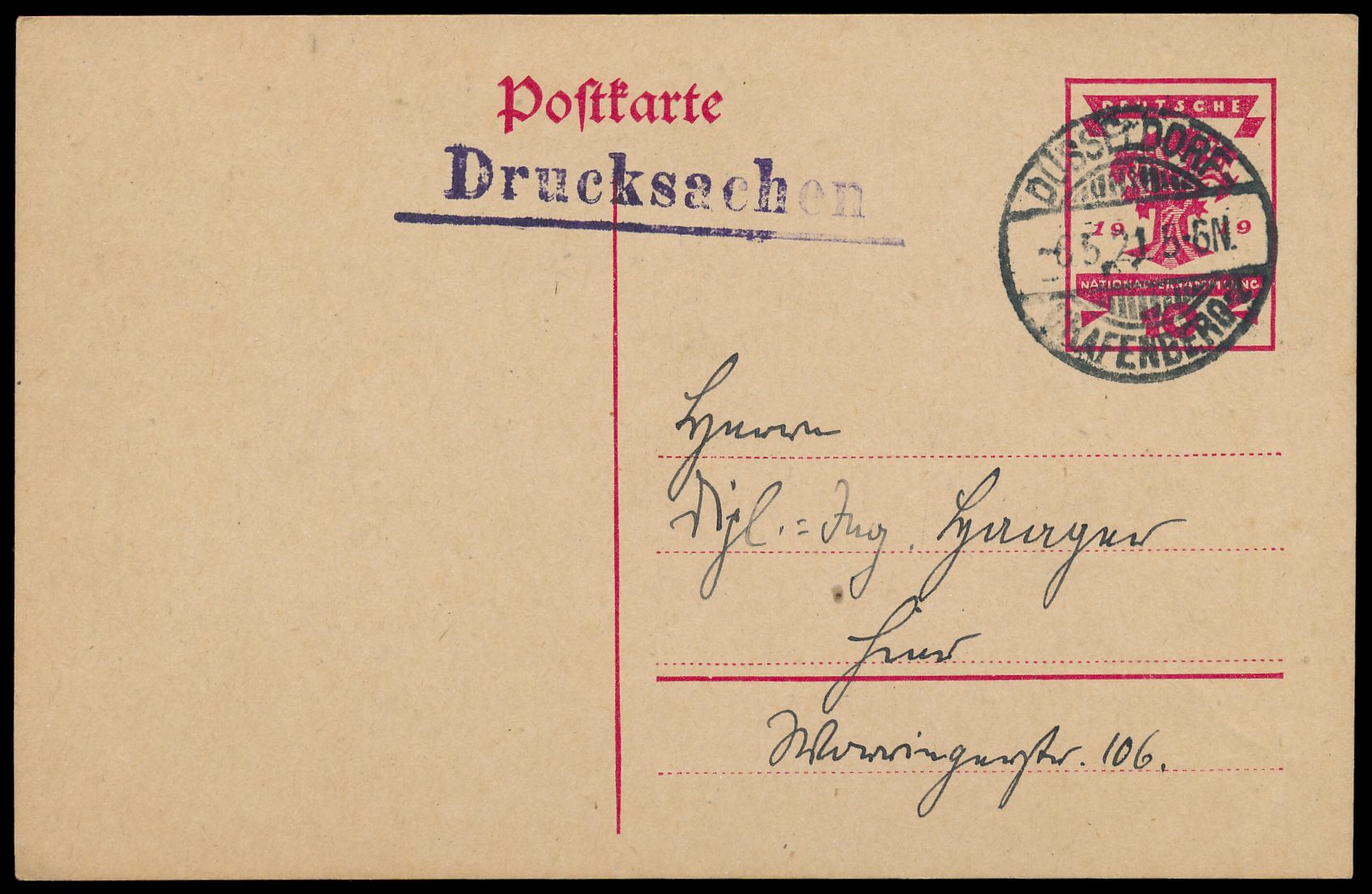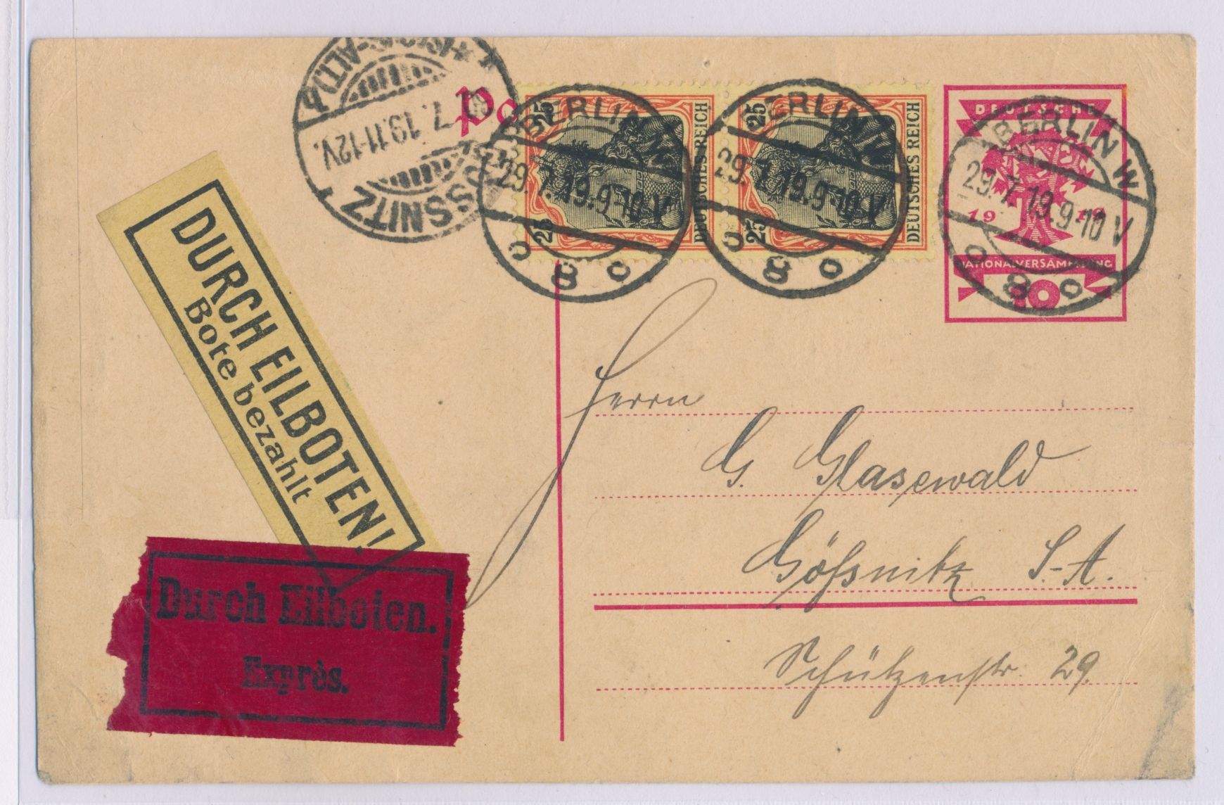 Ganzsache 10 Pf. Nationalversammlung mit Zusatzfrankatur 2 x 25 Pf. Germania als Eilboten-Karte mit Stempel Berlin W 8 29.7.19 nach Gößnitz, Ankunftstempel 30.7.19, portorichtig, Bedarf