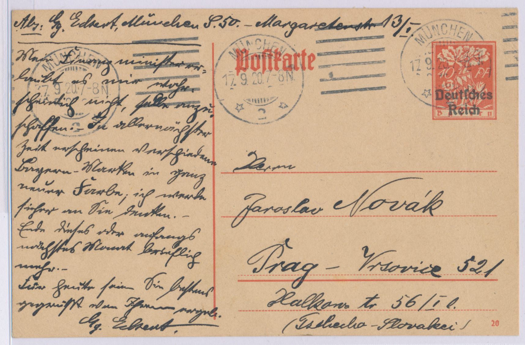 Bayern-Aufbrauchsausgabe 40 Pf. mit Maschinenstempel München 2 17.9.20 nach Prag, seltene portorichtige Auslandsverwendung, Bedarf