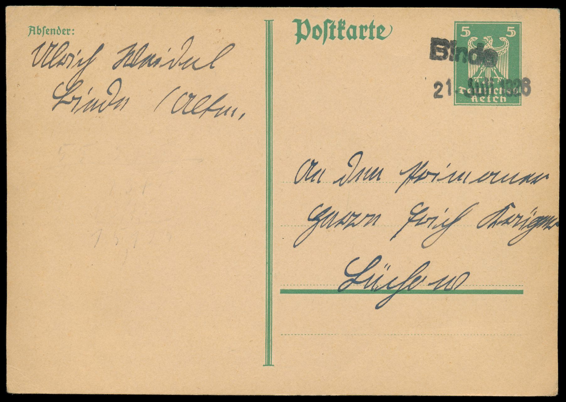 Ganzsache 5 Pf. mit schwarzem Not-L1 Binde und Datum-L1 21. Juli 1926 nach Lüchow, Bedarf