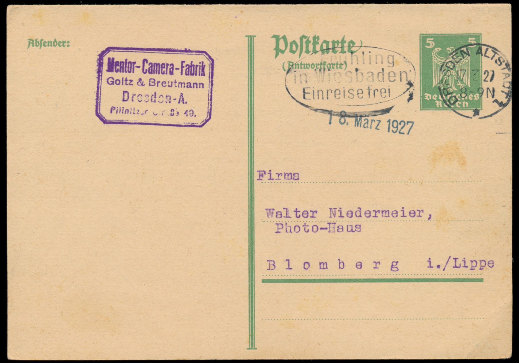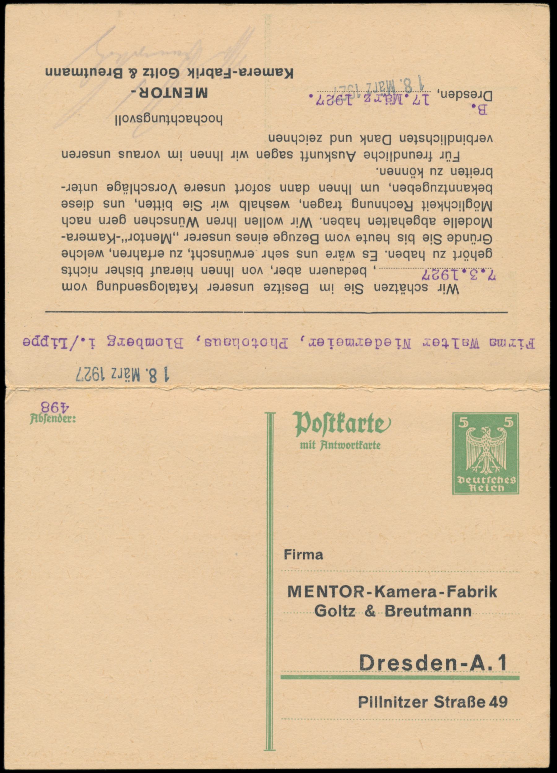 falsch gefaltete Ganzsachen-Doppelkarte 5 Pf. mit Textzudruck "Mentor-Kamera-Fabrik Dresden" auf beiden Teilen, Antwortteil mit Maschinenstempel Dresden Altstadt 1 17.3.27 (kleiner Fleck), nach Blomberg, Frageteil hängt ungebraucht an