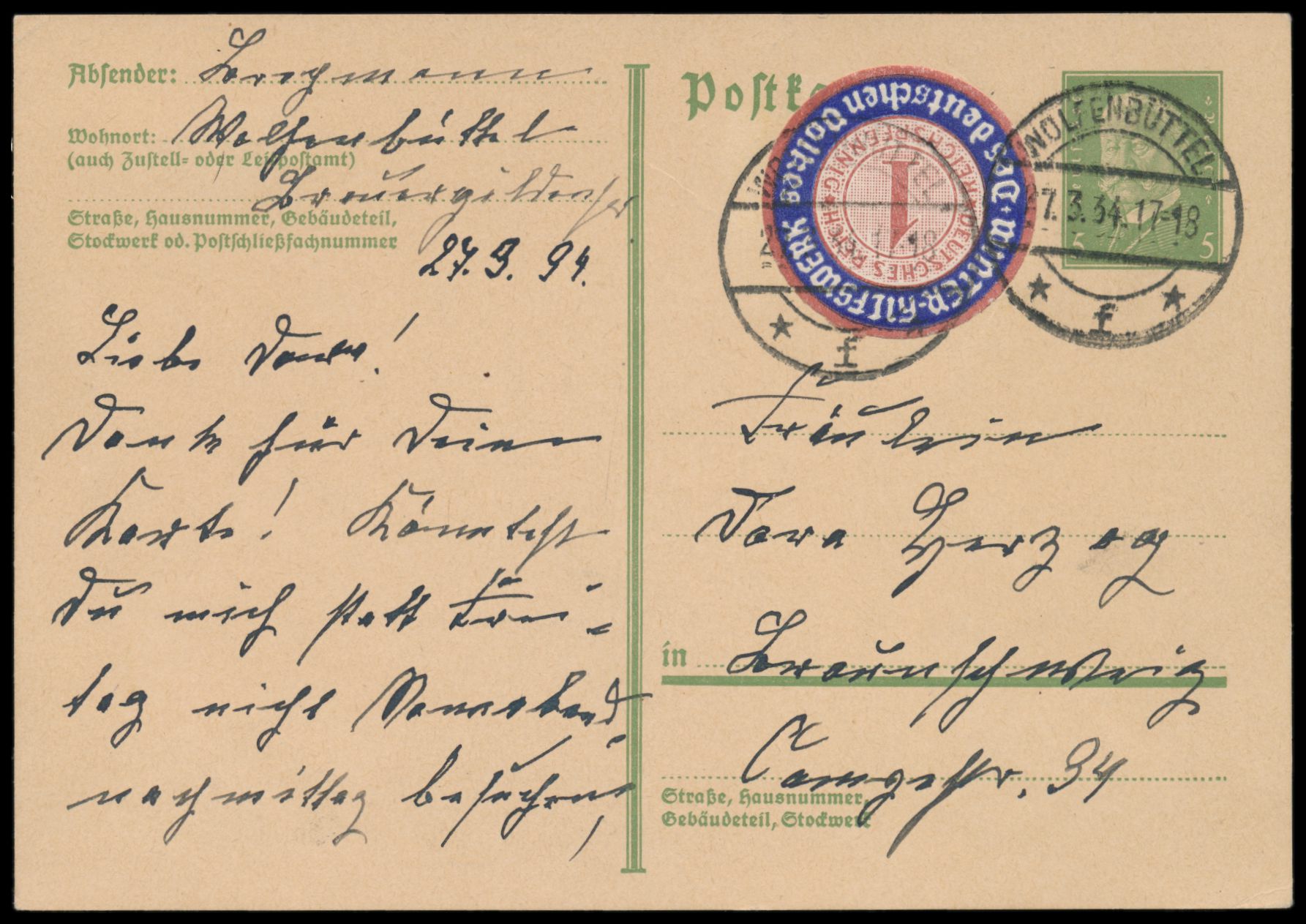 Ganzsache 5 Pf. mit WHW-Spendenmarke 1 Pf. als Briefmarken-Ersatz , Stempel Wolfenbüttel 27.3.34, nach Braunschweig, nicht beanstandet, Bedarf