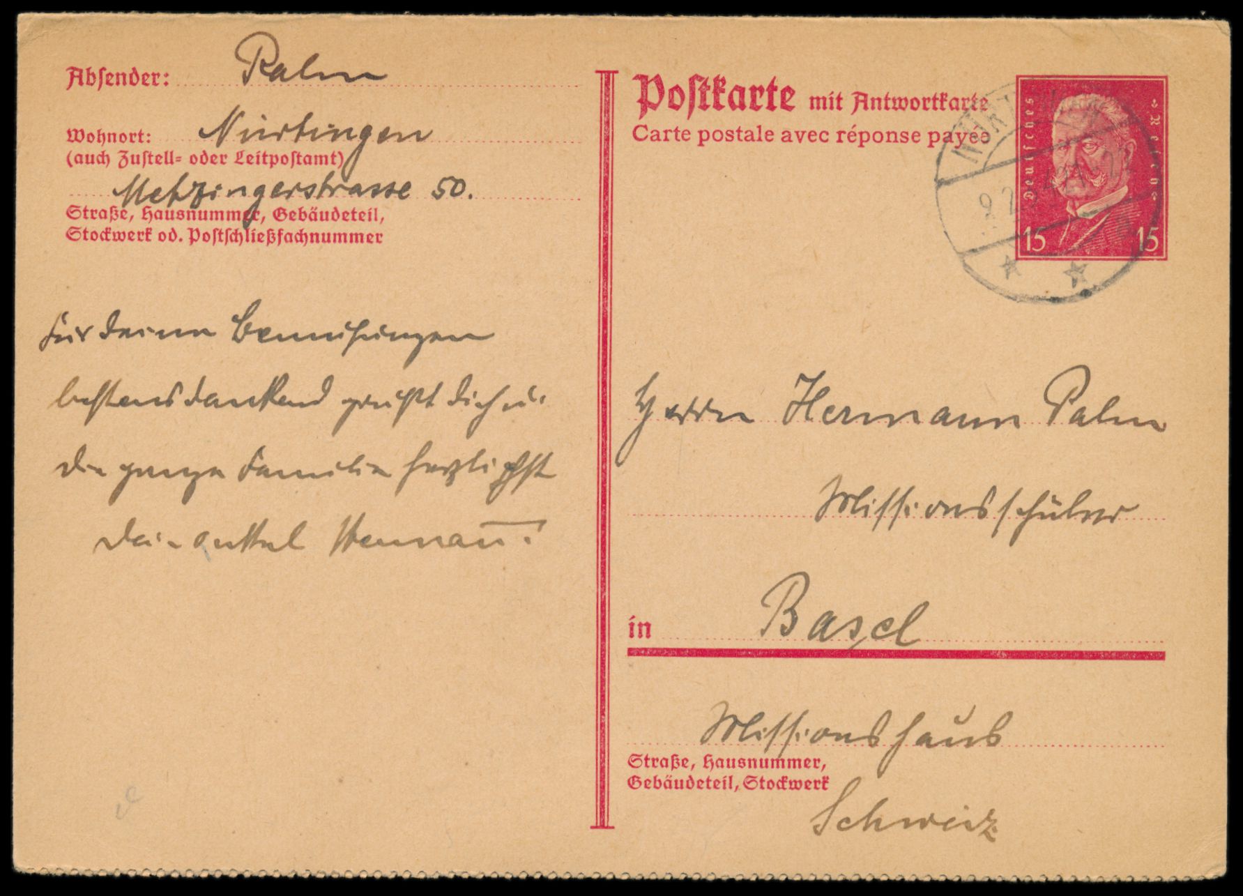 Ganzsachen-Doppelkarte 15 Pf. gezähnt mit Stempel Nürtingen 9.2.34 in die Schweiz, langer Bedarfstext, Antwortteil hängt ungebraucht an