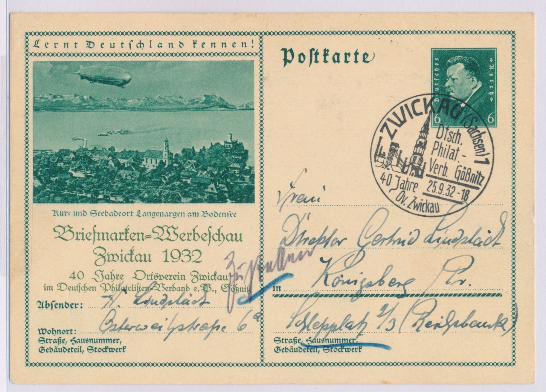 Bildganzsache 6 Pf. Ebert (Bild Langenargen mit Zeppelin) mit Zudruck "Briefmarken-Werbeschau Zwickau 1932 ...", entsprechender Sonderstempel Zwickau 25.9.32, nach Königsberg, Bedarf