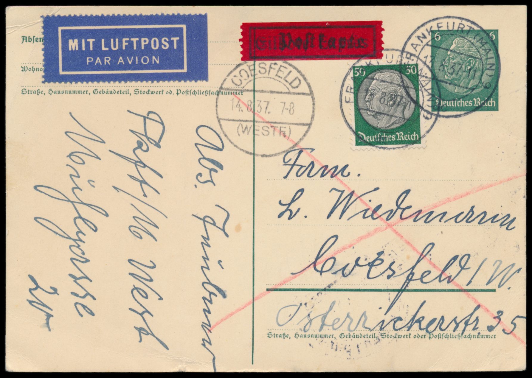 Ganzsache 6 Pf. Hindenburg mit Zusatzfrankatur 50 Pf. Hindenburg als portorichtige Luftpost-Eilboten-Postkarte, Stempel Frankfurt (Main) 9 13.8.37, nach Coesfeld, Ankunftstempel 14.8.37, portorichtig, Bedarf