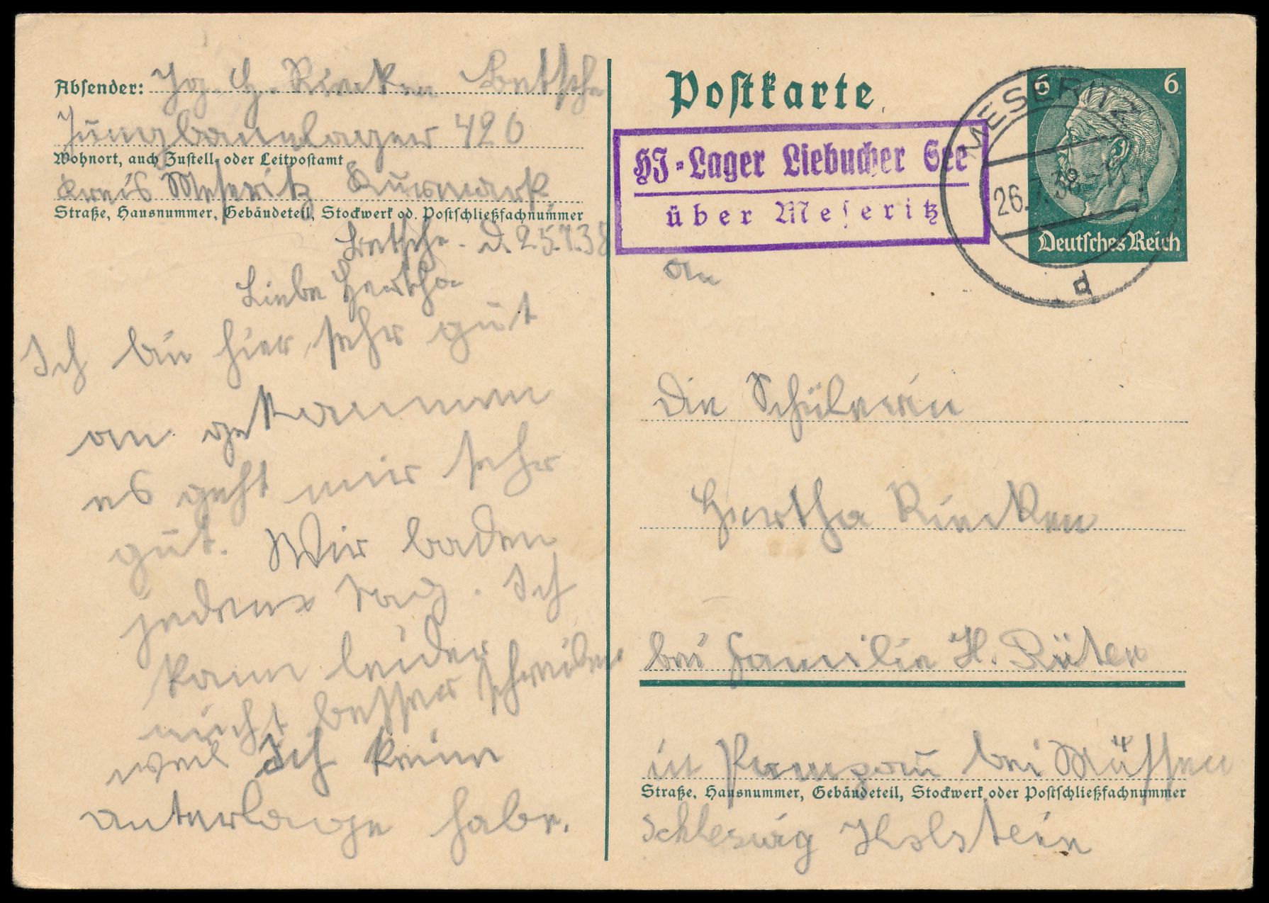 Ganzsache 6 Pf. mit PSt II-Stempel HJ-Lager Liebucher See über Meseritz und Stempel Meseritz 26.7.38, Absender "... Jungbannlager 426 ..."