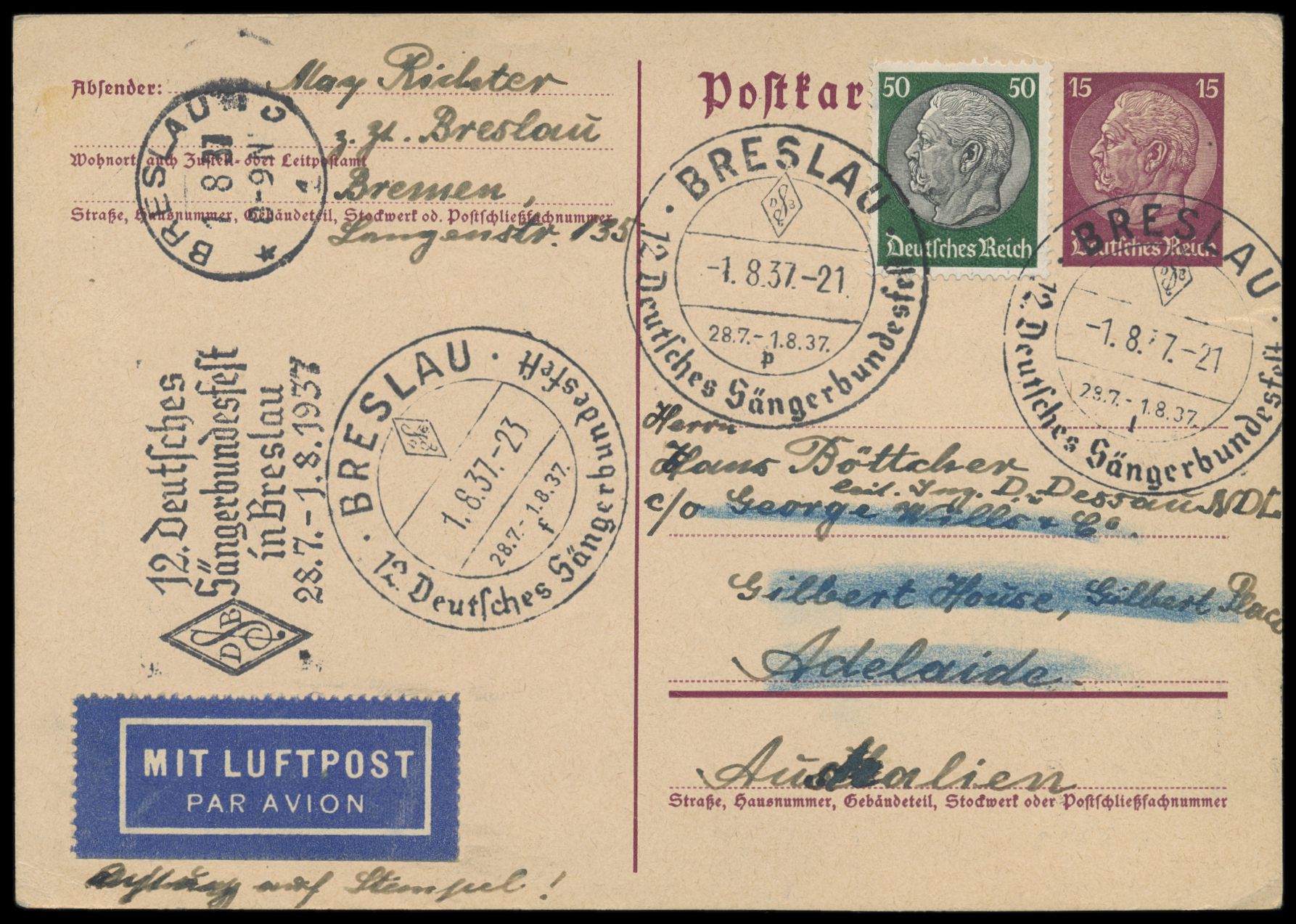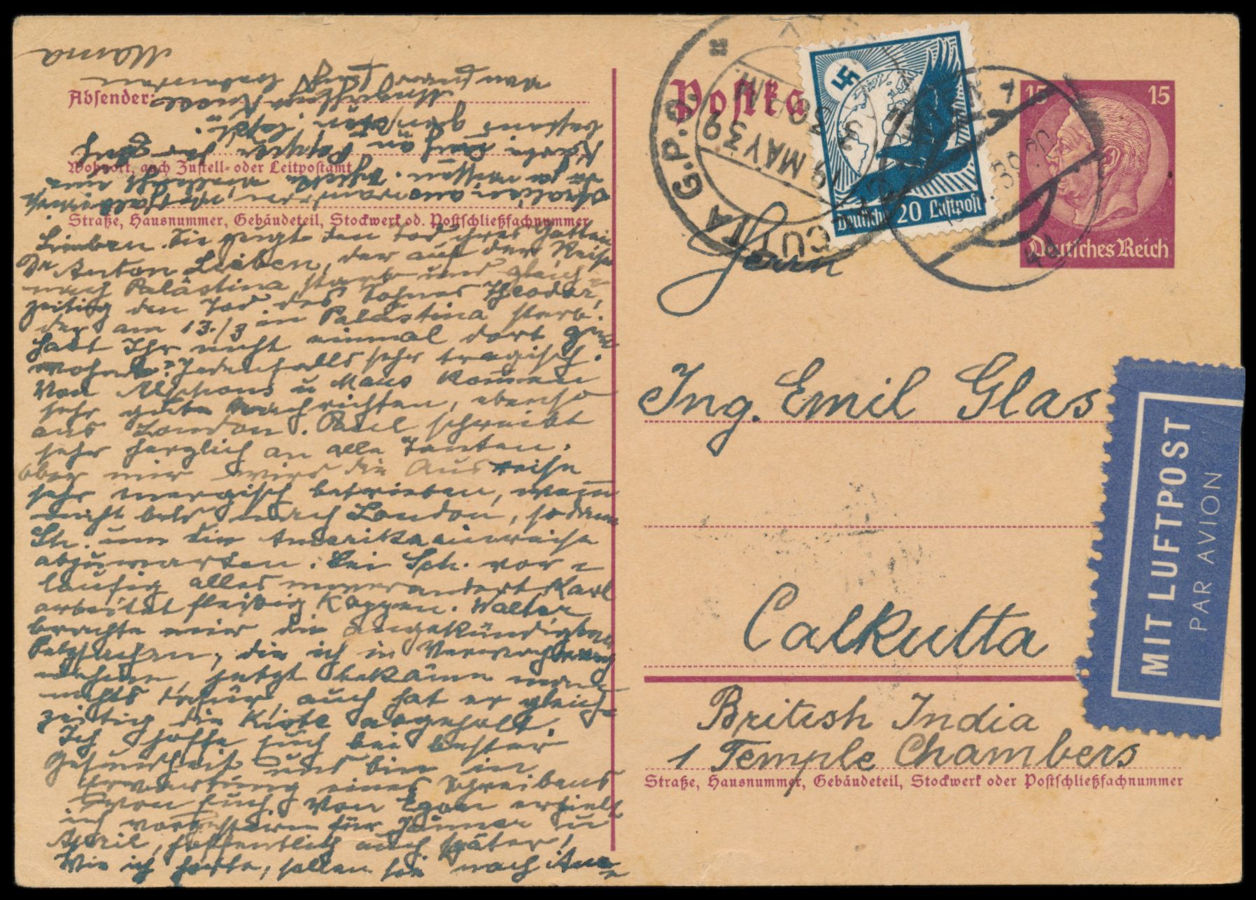 Auslands-Ganzsache 15 Pfg. Hindenburg mit Zusatzfrankatur 20 Pfg. Flugpost, Stempel Wien 13.5.39, viel Text, nach Calcutta, Ankunftstempel 19.5.39