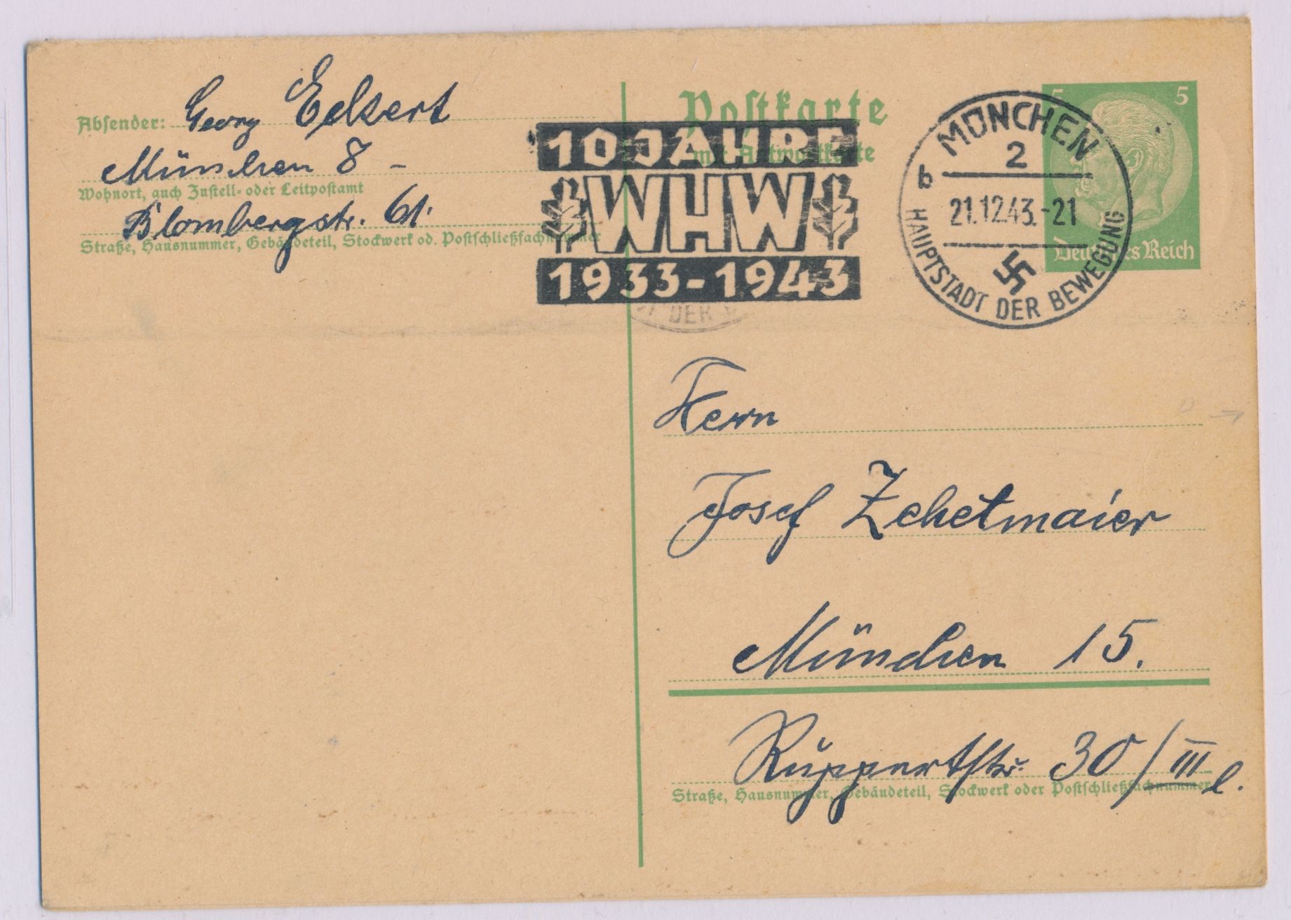 Ganzsachen-Doppelkarte 5 Pf. Hindenburg als Ortskarte zusammenhängend in beiden Richtungen befördert, Frageteil mit Maschinenstempel München 2 21.12.43 und Antwortteil mit Stempel München 15 22.12.43, jeweils lange Bedarfstexte