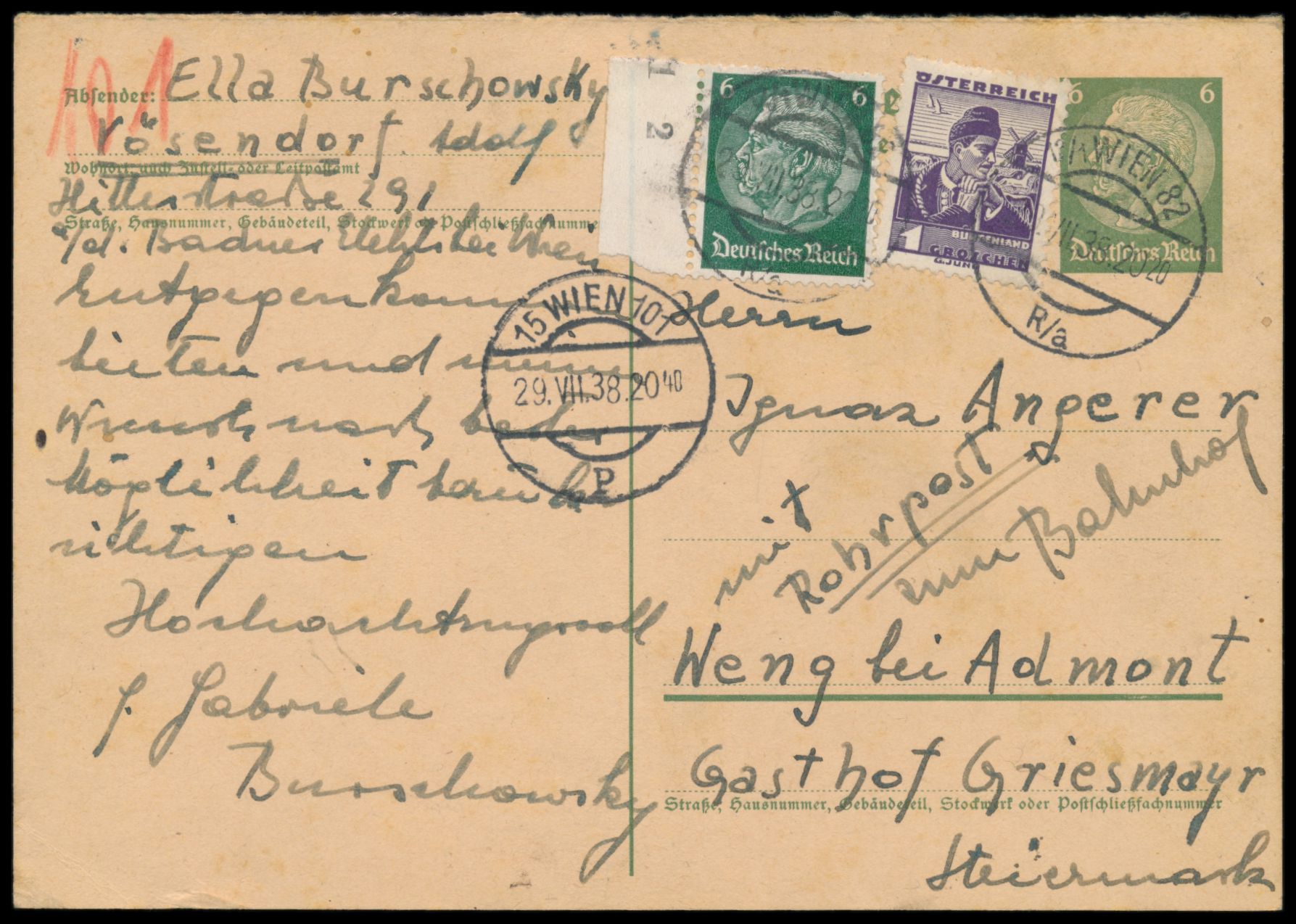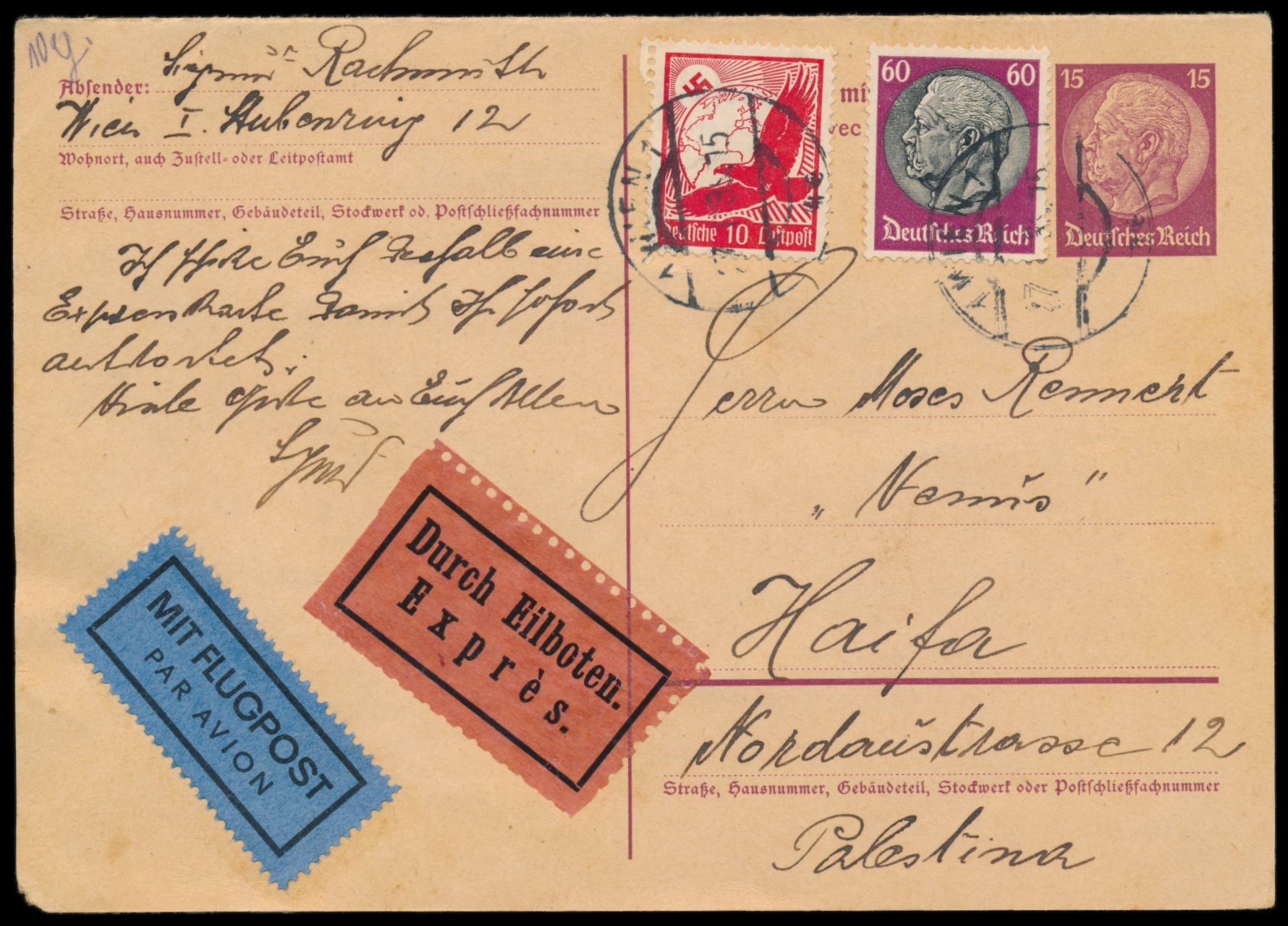 Doppel-GA 15 Pfg. Hindenburg, Frageteil Stempel Wien 27.1.39, mit Zusatzfrankatur 60 Pfg. Hindenburg und 10 Pfg. Flugpost als Luftpost-Eilboten-Karte nach Palästina, langer Text, Antwortteil hängt ungebraucht an