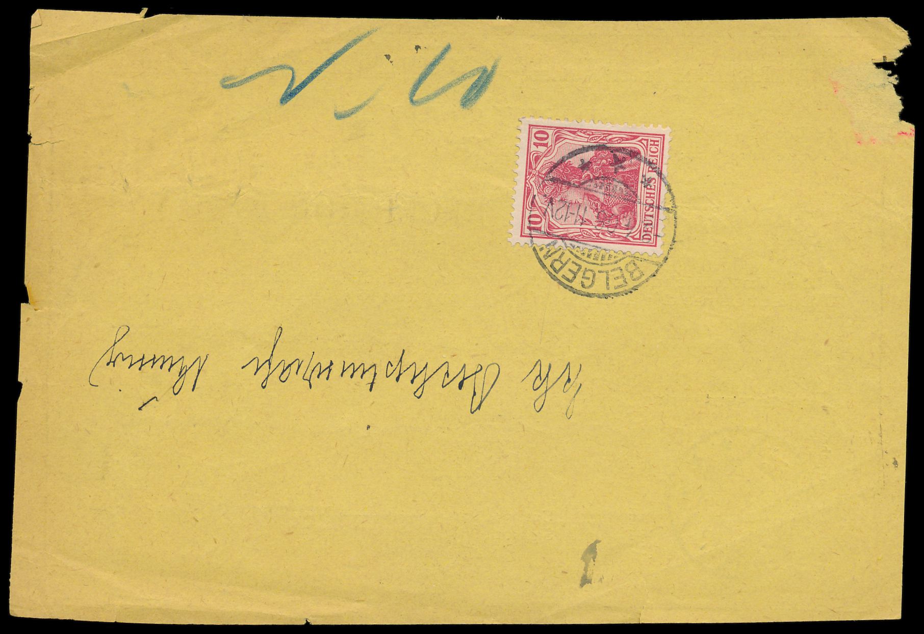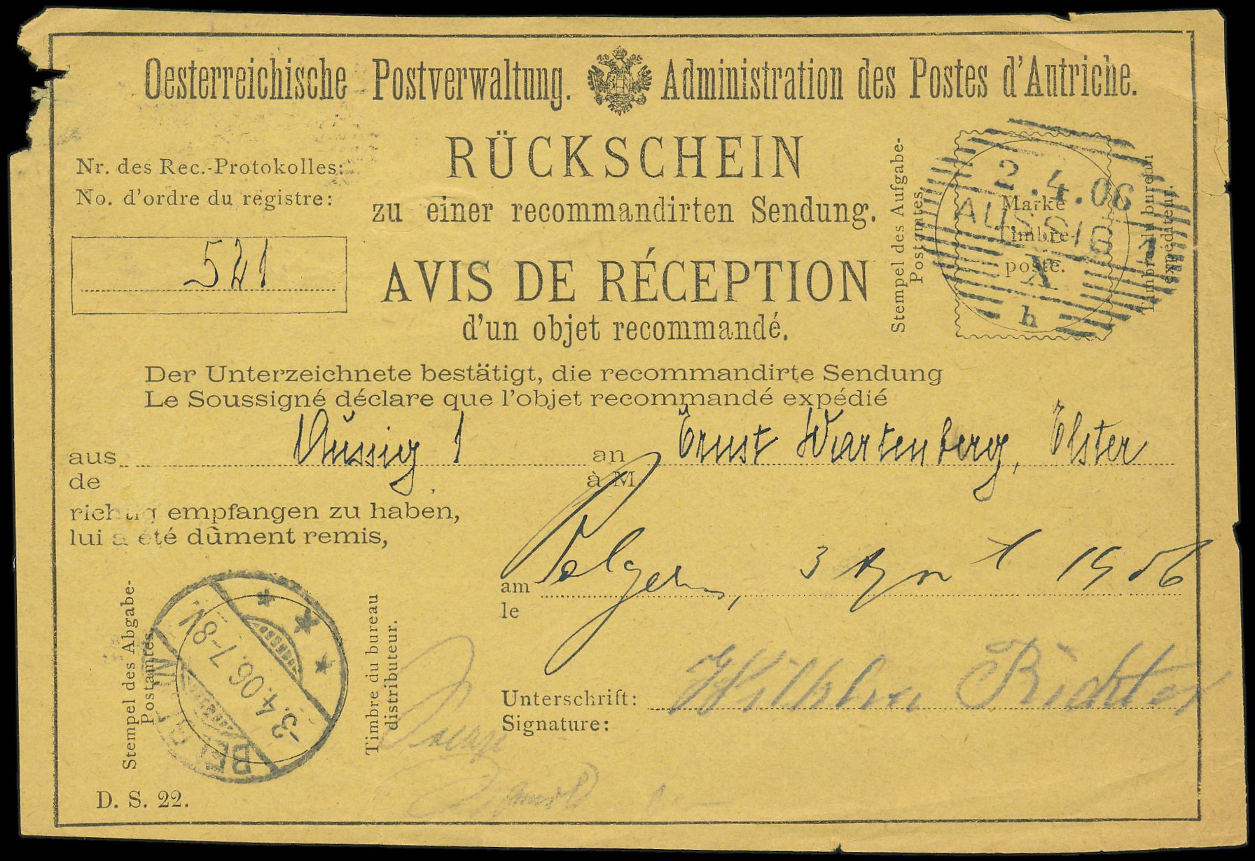 Rückschein-Formular der Österreichischen Postverwaltung für einen Einschreibbrief von Aussig 2.4.06 nach Belgern mit Ankunftstempel 3.4.06, rückseitig 10 Pf. Germania frankiert und mit Stempel Belgern 3.4.06 zurück nach Aussig