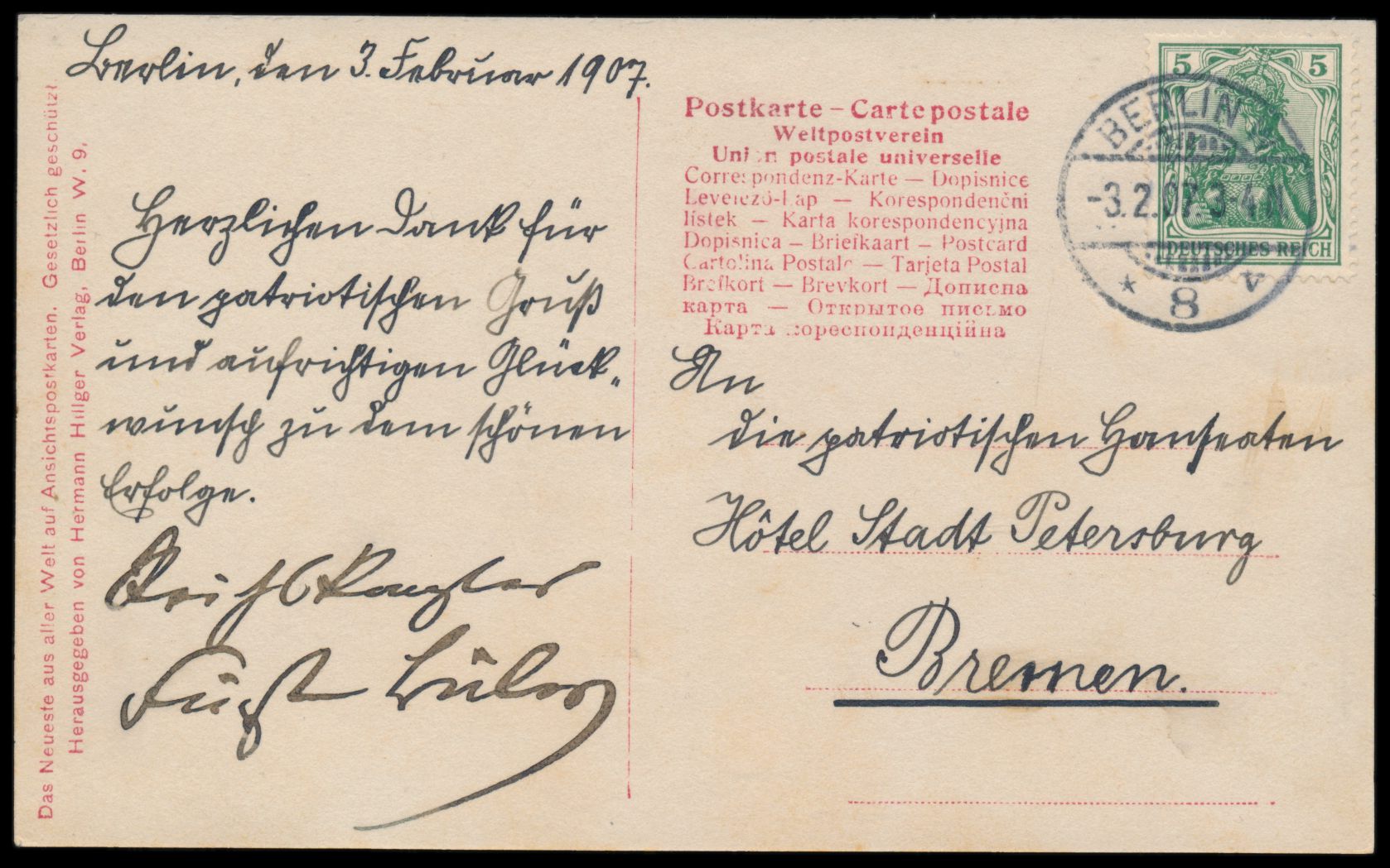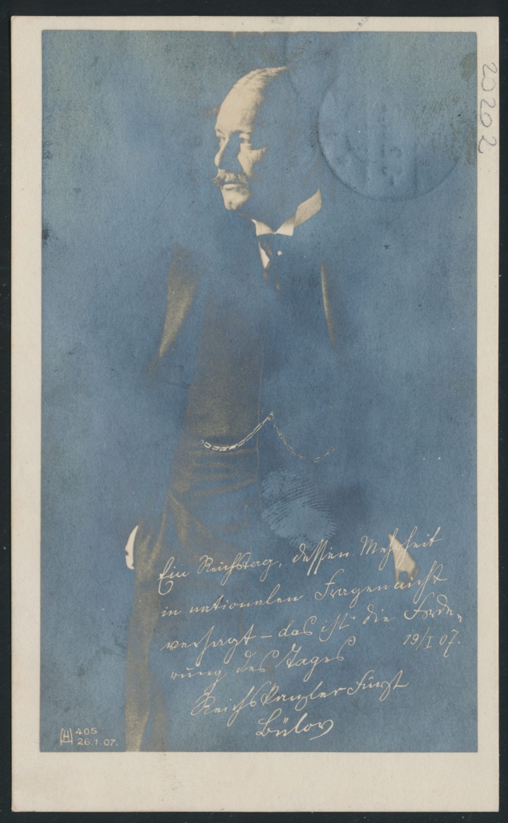 Foto-Ansichtskarte Reichskanzler Fürst Bülow (Portraitaufnahme) mit handschriftlichem Danksagungstext und eigenhändiger Unterschrift ""Reichskanzler Fürst Bülow"", Frankatur 5 Pf., Stempel Berlin W 8 3.2.07, nach Bremen