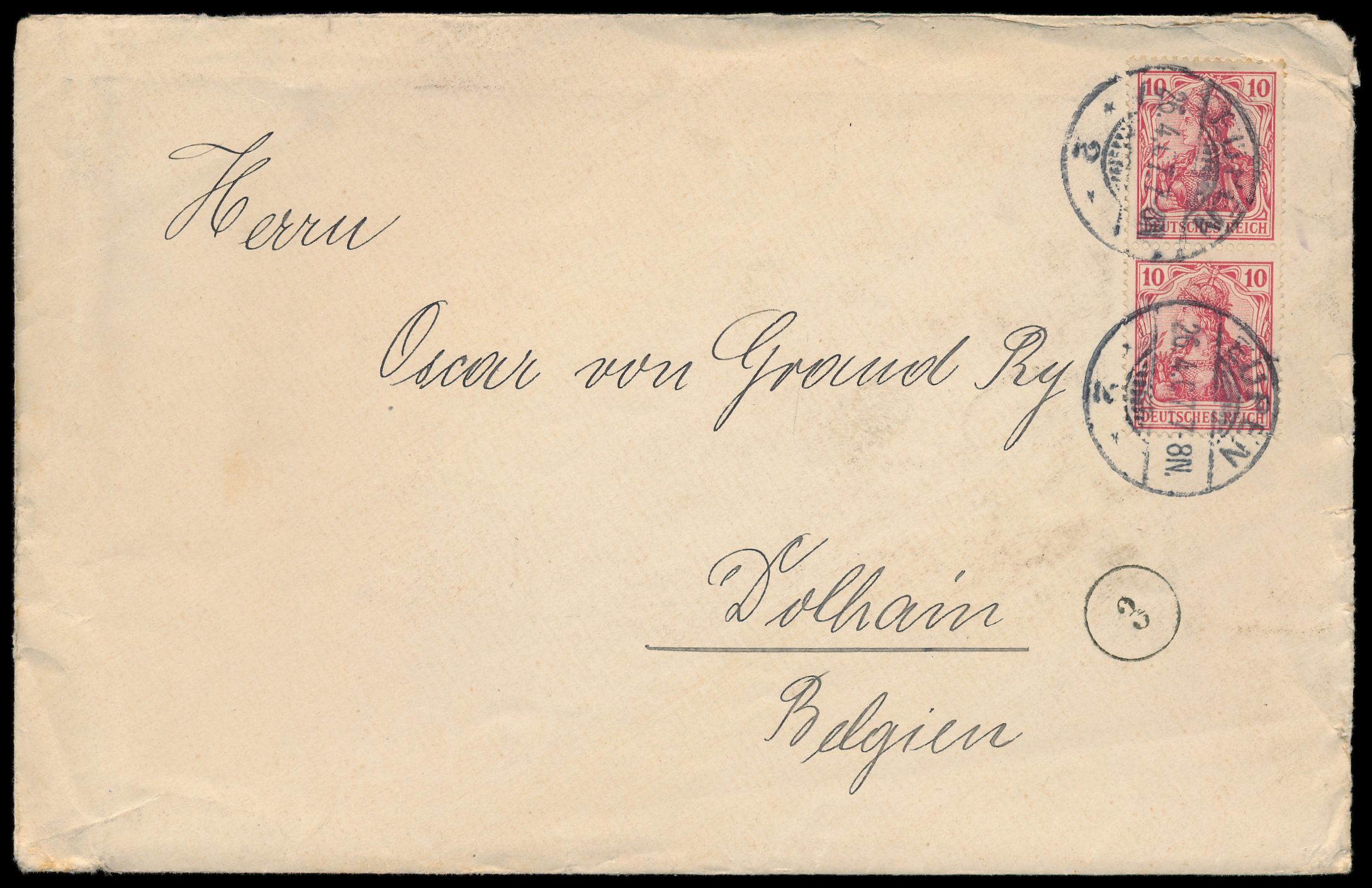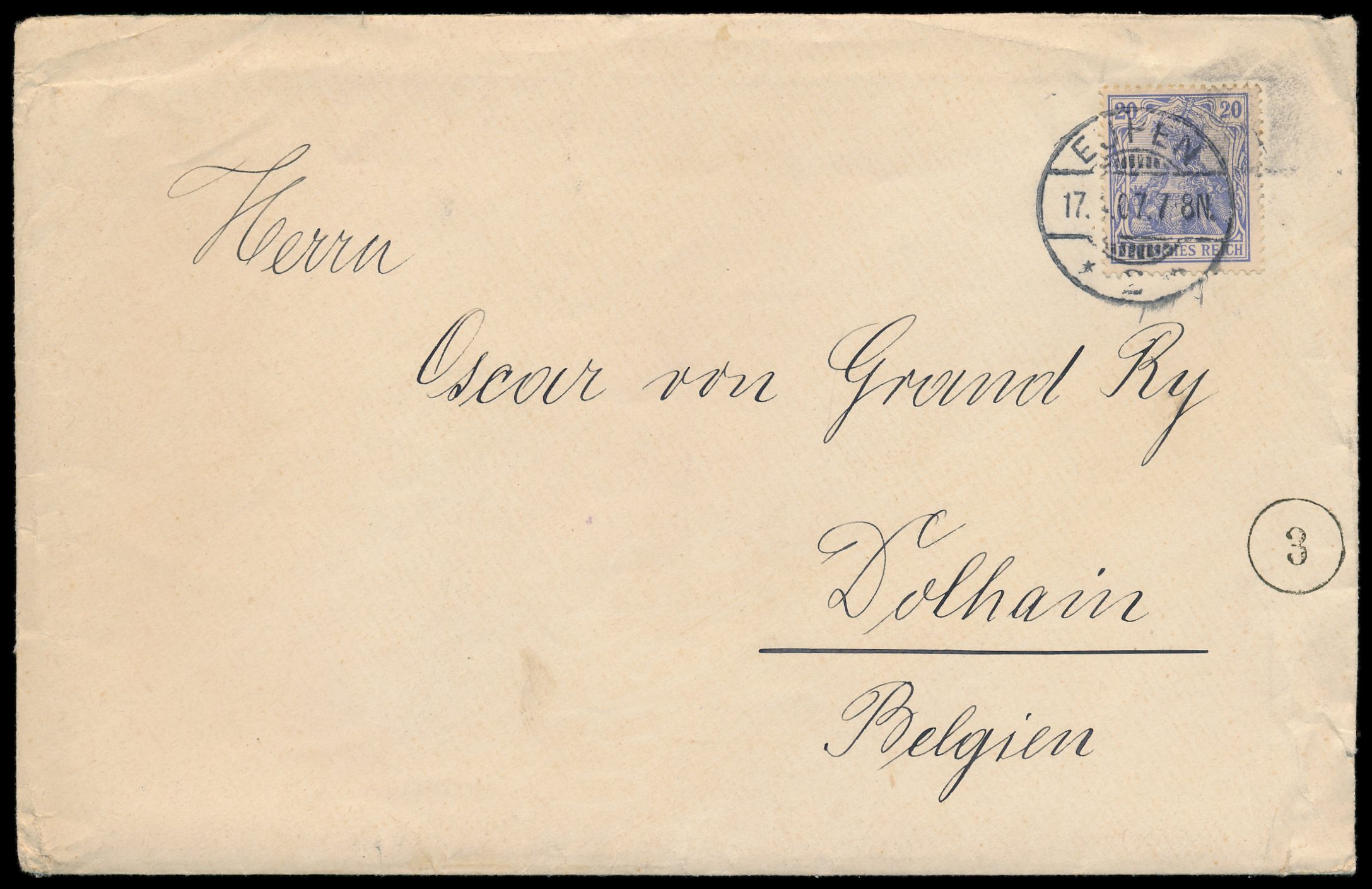 Einzelfrankatur 20 Pf. auf Brief 2. Gewicht mit Stempel Eupen 2 17.4.07 zum Grenztarif nach Dolhain / Belgien, Entfernung ca. 7 Kilometer Luftlinie, Ankunftstempel 18.4.07, Bedarf