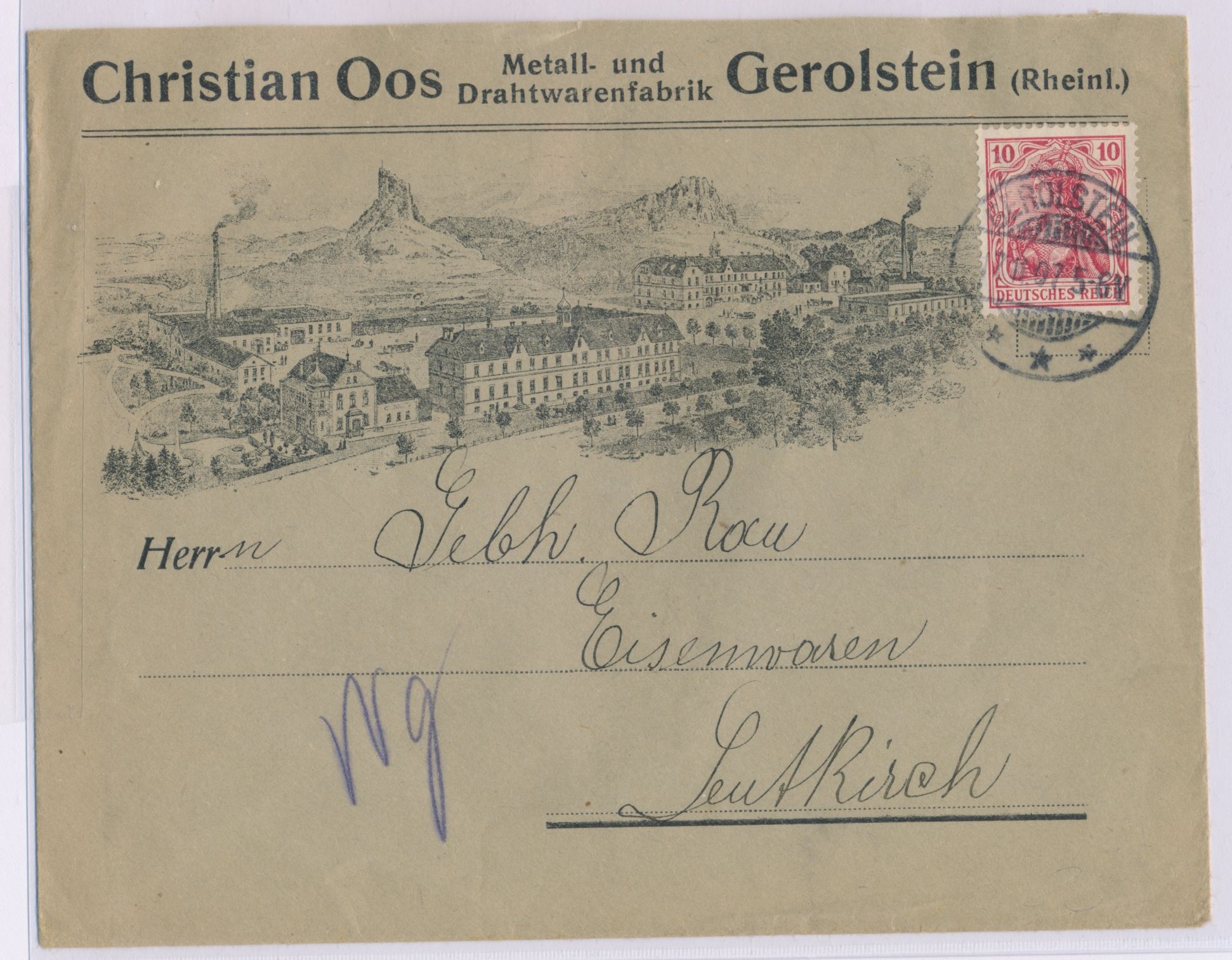 10 Pf. auf dekorativem Reklameumschlag "Christian Oos ... Gerolstein (Rheinl.), Stempel Gerolstein 17.11.07, nach Leutkirch, Ankunftstempel 18.11.07