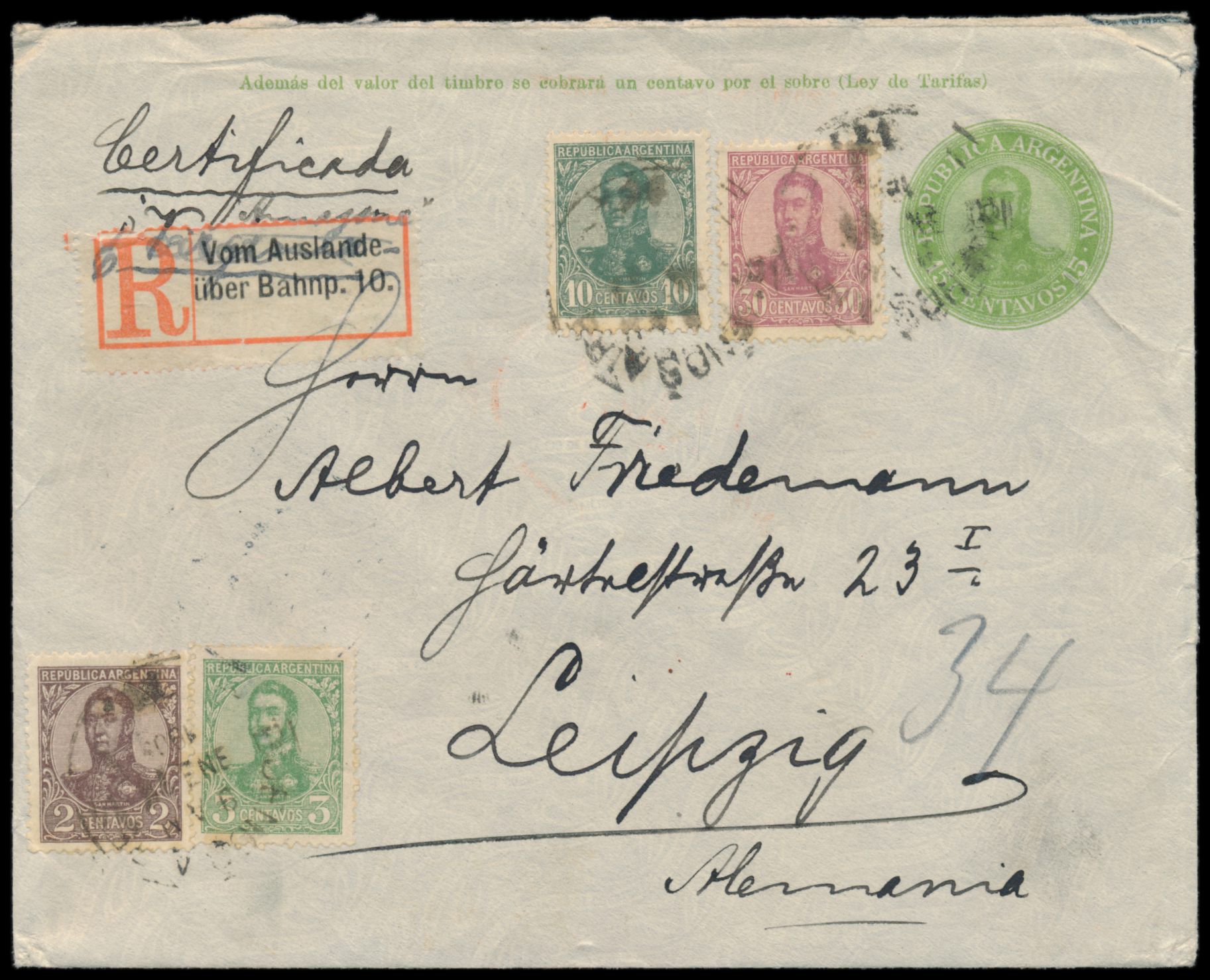 Argentinien-Ganzsachenumschlag 15 C. mit Zusatzfrankatur General San Martin 2, 3, 10 und 30 C. als Einschreiben von Buenos Aires 1908 nach Deutschland, R-Zettel "Vom Auslande über Bahnp. 10." , Ankunftstempel Leipzig 21.2.08