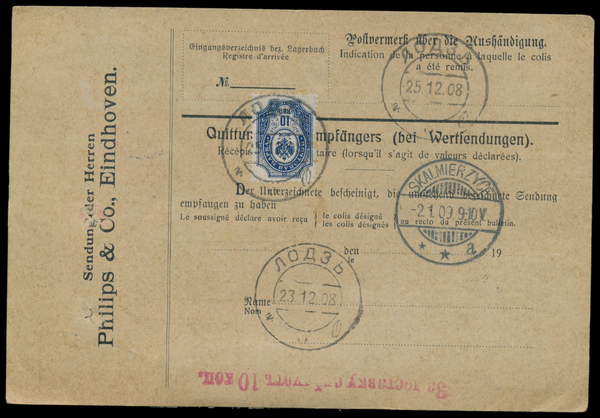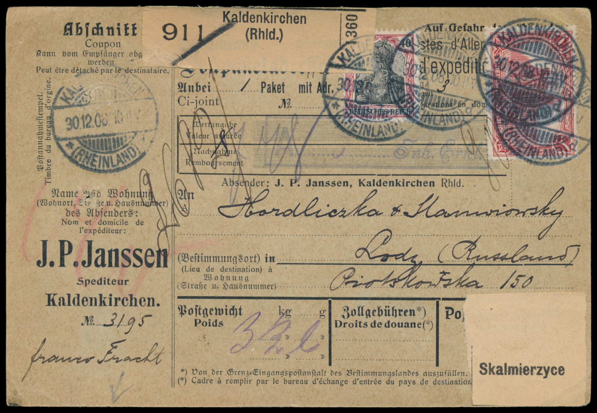 40 Pf. und 1 M. auf Auslandspaketkarte mit Stempel Kaldenkirchen (Rheinland) 30.12.08 über Skalmierzyce 2.1.09 nach Lodz, rückseitig Russland 10 Kop.-Marke als Zustellgebühr, Stempel Lodz 25.12.08