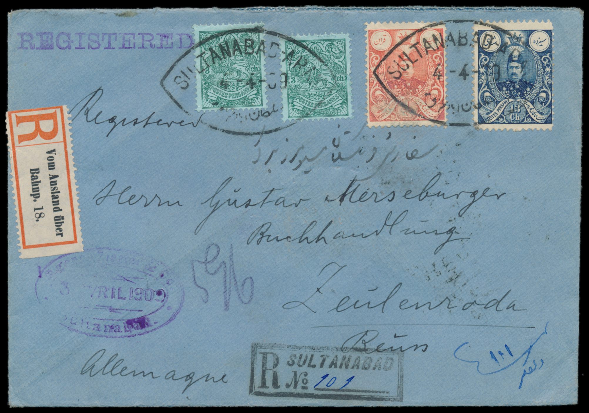Persien 2 x 3 Ch. (1903) und 13 Ch. und 1 Kr. (1908) auf Einschreibbrief mit Stempel Sultanabad-Arak 4.4.09 und R-Stempel Sultanabad nach Deutschland, Durchgangsstempel Teheran 7.4.09, R-Zettel "Vom Ausland über Bahnp. 18" (seltene Variante: nur waagerecht gezähnt)