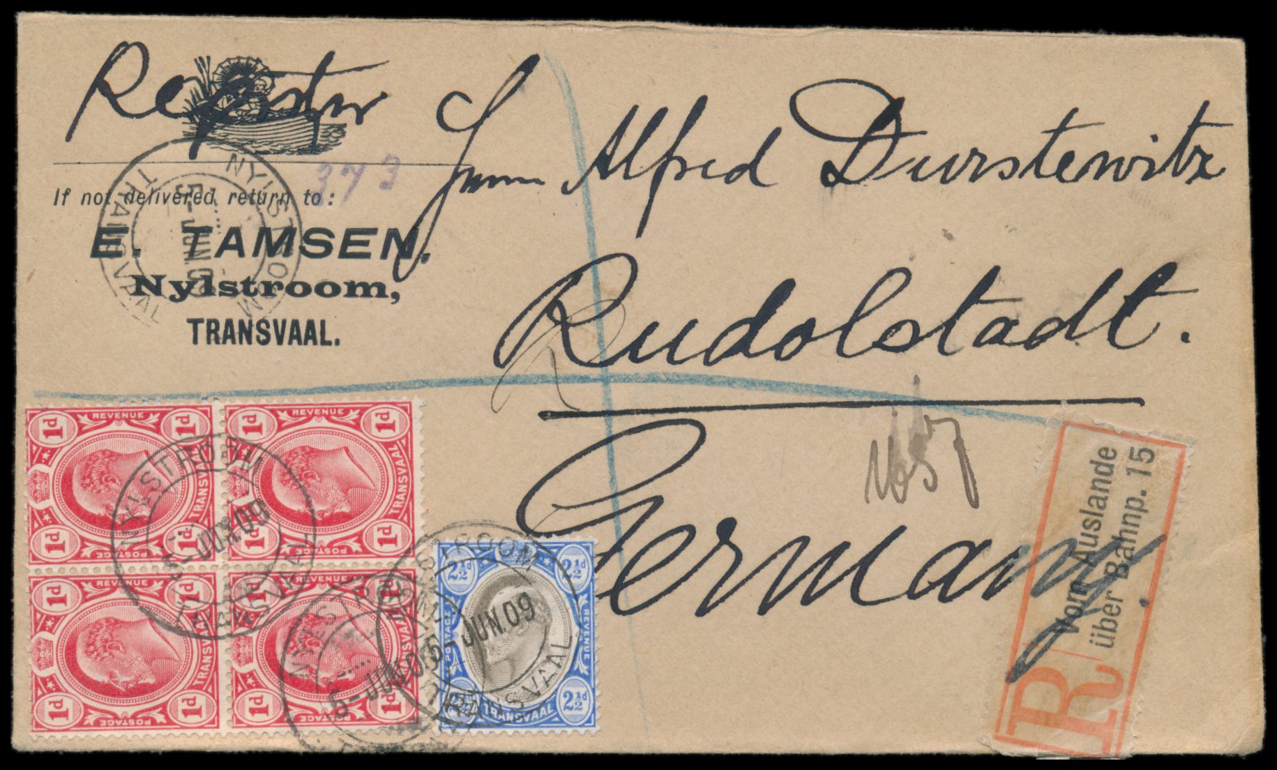 Transvaal 1 d. (Viererblock) und 2 1/2 d. auf Einschreibbrief mit Stempel Nylstroom 5.6.09 nach Deutschland, Durchgangstempel Pretoria 6.6.09 und Bahnpoststempel Hannover - Boxtel Zg. 186 26.6.09, R-Zettel "Vom Auslande über Bahnp. 15"