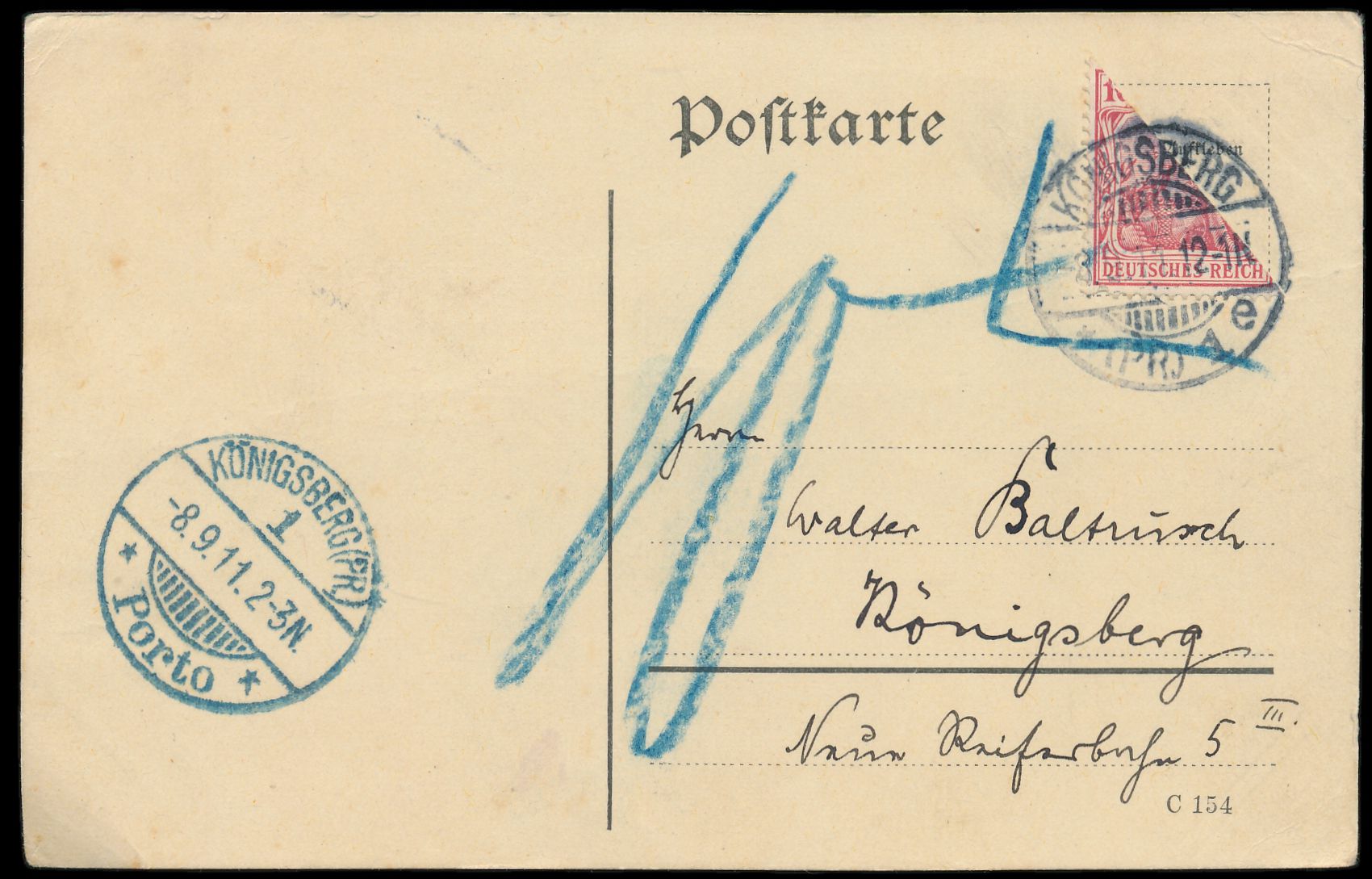 10 Pf. diagonal halbiert auf Ortskarte mit Stempel Königsberg (Pr.) 1 8.9.11, beanstandet, Nachgebühr 10 Pf., blauer Stempel Königsberg (Pr.) 1 Porto 8.9.11