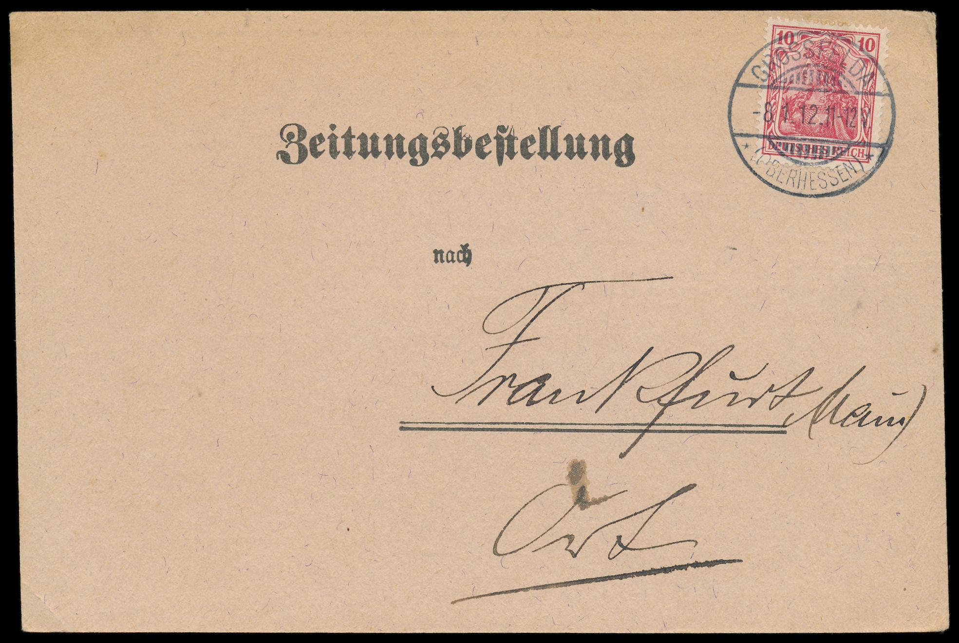 Einzelfrankatur 10 Pf. auf Vordruckkarte Zeitungsbestellung (Zeitungssache), Stempel Grossfelda (Oberhessen) 8.1.12, nach Frankfurt / Main
