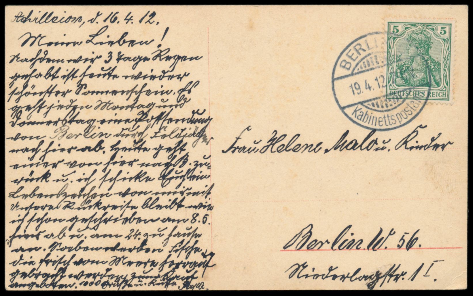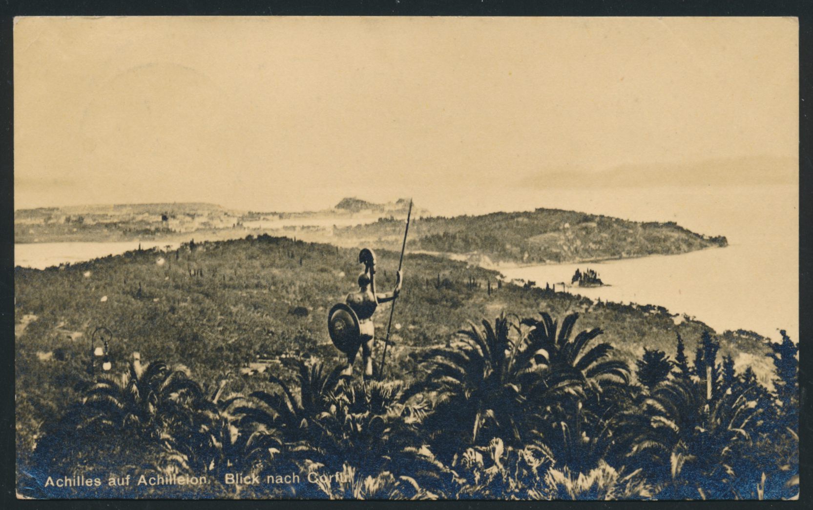 5 Pf. Germania mit Stempel Berlin Kabinettspostamt 19.4.12 auf Foto-Ansichtskarte "Achilles auf Achilleion - Blick auf Corfu", geschrieben "Achilleion, d. 16.4.12", im Auftrag der österreichischen Kaiserin Elisabeth erbauter Palast und 1907 von Kaiser Wilhelm II. erworben und zu einem diplomatischen Zentrum umgebaut, Bedarf